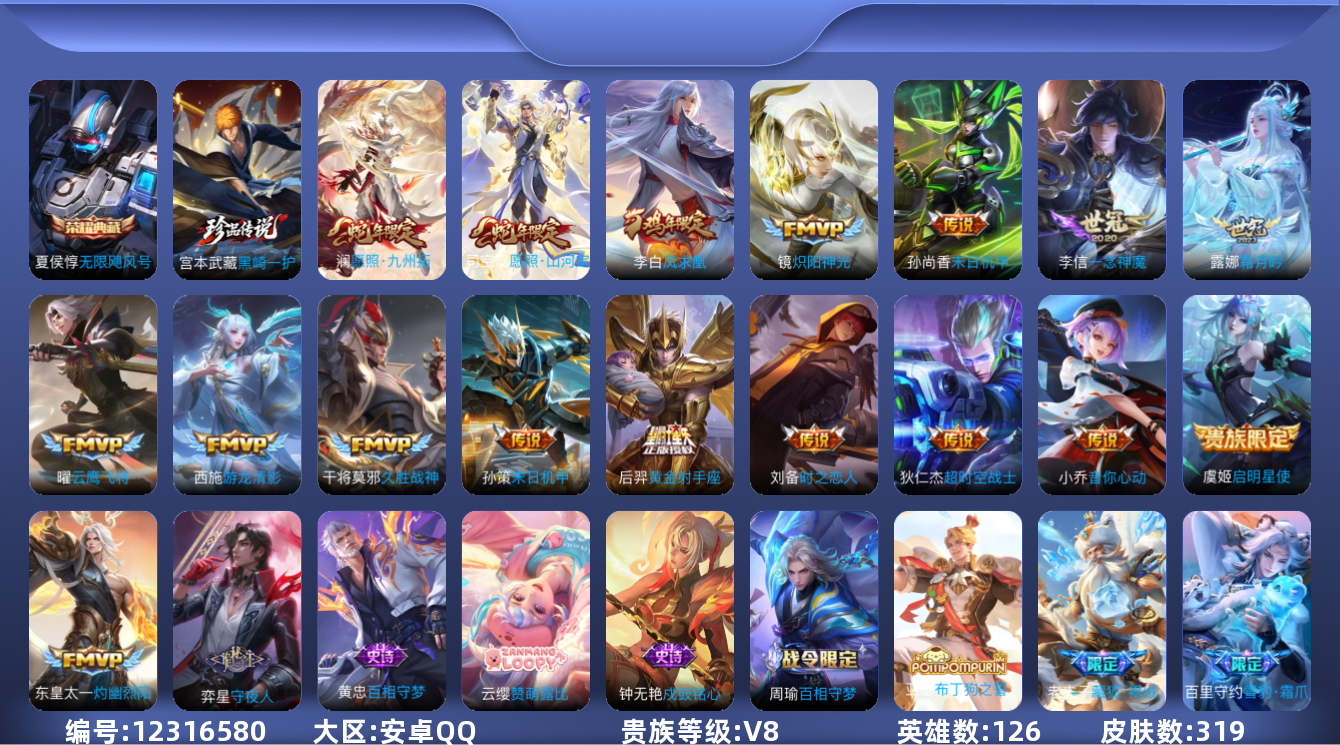 - [11625950]V9 3典藏 1珍品传说 26传说 126英雄 324皮肤 典藏英雄武则天 可修改实名 优质装备:倪克斯神谕(宇宙婆娘),鸣剑·曳影,弑枪猎影(韩信典藏),怪盗基德,黄金狮子座,冠军飞将,猫影幻舞,久胜战神,炽阳神光,一念神魔,地狱火,仲夏夜之梦(大飞蛾),零号·赤焰,海洋之心,地狱之眼,李逍遥,挚爱之约,无双飞将 传说皮:祥瑞亨通,幻光神枪 珍宝阁皮:优雅恋人,蔷薇恋人 限定皮:愿照·岁时盈(虞姬年限),愿照·山河定(司空震年限),鸣野蒿,白虎志(电光耗子),凤求凰(白切鸡),凤凰于飞,太华(伽罗年限),时雨天司(水龙头),神威(电光马子),飞衡(韩信年限),高山流水,五谷丰年,梁祝,祈雪灵祝(雪兔子),天狼绘梦者,李小龙,朱雀志(守约年限),辉光之辰,如梦令-后羿,大圣娶亲,天魔缭乱 史诗皮:鸭鸭历险记-刘禅,星界战将,龙之律动,茶境仙,怒海争锋,炽弈燎原,紫霞仙子,苍穹之光,电玩小子(小书包),白龙吟,黄金分割率,特工魅影,千年之狐,百相守梦(关羽),电玩·爆裂旋风,高渐离燃音魔法,蒙恬荣光圣徽,偶像歌手,龙骑士(小龙虾),暗夜猫娘,魅语,末日机甲-吕布,乱世虎臣,节奏热浪,修罗,女仆咖啡,摇滚巨星,水果甜心,绅士熊喵,天才门将,星夜王子,心灵骇客,功夫厨神,德古拉伯爵,暗隐猎兽者,幽灵船长,鬼剑武藏,暗渊魔法,心灵战警,天秀·启明,舞动绿茵,纤云弄巧,繁星吟游(呼啦呼啦),缤纷独角兽,乘风破浪,逐浪之夏,水晶猎龙者,曙光守护者,箭羽风息,金属风暴,原初追逐者,圣诞狂欢,圣诞恋歌,鹰眼统帅,魅力维加斯,黎明之约,赏金猎手,无心,未来纪元-赵云