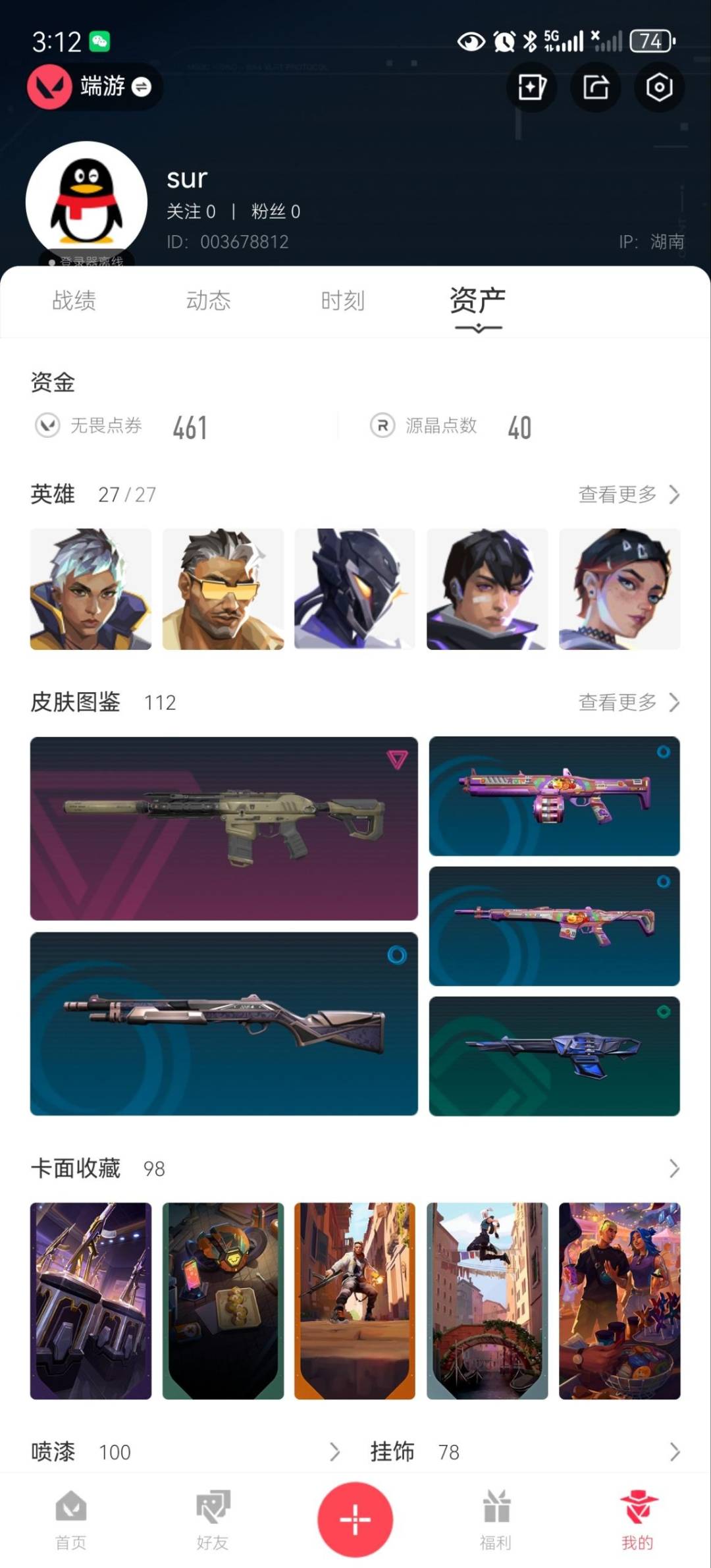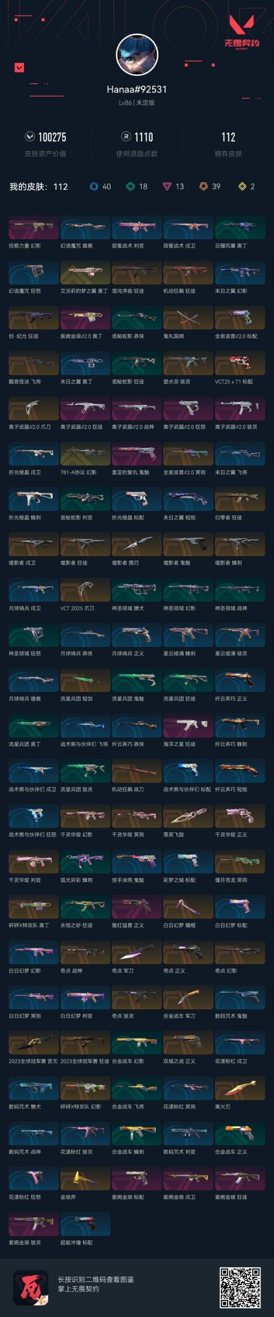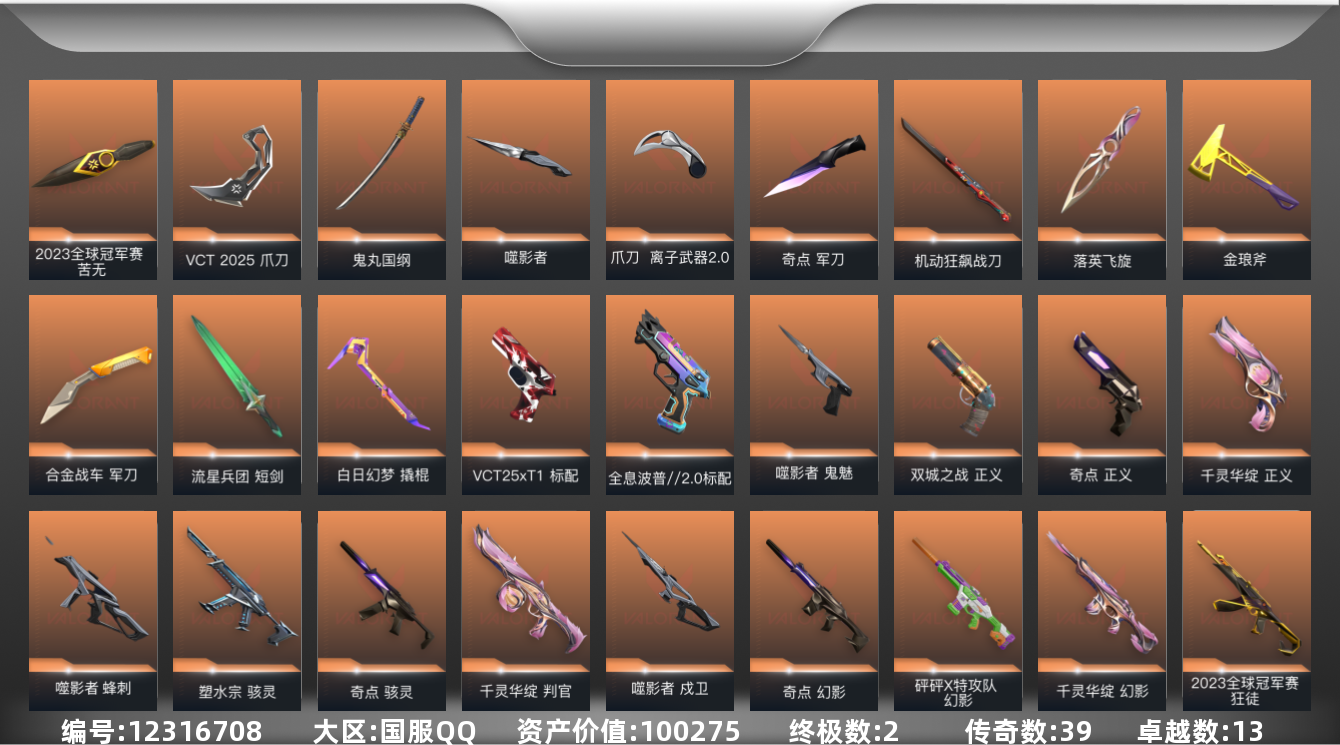 [12316708]39橙皮 2金皮 13紫皮 112皮肤 27英雄 98卡面 1110已用源晶 未定级 优质装备:千灵华绽套装,紫阙金琅套装,奇点套装,2023全球冠军赛套装,离火刃,正义-双城之战,正义-奇点,冥驹-偃月苍龙,狂徒-2023全球冠军赛,狂徒-归零者,幻影-781-A协议,幻影-千灵华绽,冥驹-千灵华绽,狂徒-混沌序曲,幻影-奇点,幻影-砰砰X特攻队,狂徒-紫阙金琅,幻影-侦察力量,狂徒-机动狂飙,正义-千灵华绽,冥驹-全息波普//2.0,奥丁-艾沃莉的梦之翼,标配-紫阙金琅,骇灵-奇点,奥丁-砰砰X特攻队,军刀-合金战车,金琅斧,军刀-奇点,撬棍-白日幻梦,鬼魅-盖亚的复仇,机动狂飙战刀,奥丁-紫阙金琅2.0,骇灵-塑水宗,判官-千灵华绽,落英飞旋,标配-全息波普//2.0,鬼丸国纲,VCT 2025 爪刀,噬影者簇刃,离子武器2.0 爪刀,骇灵-紫阙金琅,戍卫-紫阙金琅 亮点皮肤:苦无-2023全球冠军赛 套装:白日幻梦套装,离子武器2.0,噬影者,VCT 2025赛季礼包,VCTCN2025套装 佩枪皮肤:狂怒-离子武器2.0,鬼魅-噬影者,标配-VCT25xT1,正义-猩红猛兽 冲锋枪皮肤:骇灵-离子武器2.0,蜂刺-噬影者 步枪皮肤:狂徒-创·纪元,戍卫-噬影者,狂徒-噬影者,狂徒-离子武器2.0,狂徒-海洋之星 狙击枪皮肤:飞将-黯夜怪谈 机枪皮肤:战神-奇点,战神-离子武器2.0 近战武器皮肤:短剑-流星兵团