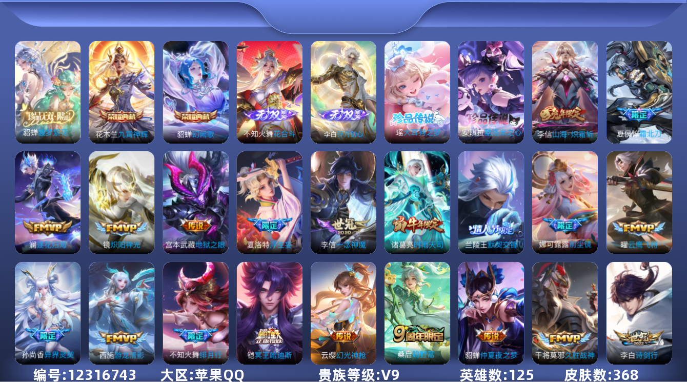 [12316743]V9 2典藏 1珍品无双 1无双 2珍品传说 36传说 124英雄 363皮肤 可修改实名 优质装备:馥梦繁花,九霄神辉(木兰典藏),幻阙歌(貂蝉典藏),花合斗,酷洛米之心,大耳狗之梦,黄金射手座,云鹰飞将(小将军),绛天战甲(鸡嘴战神),猫影幻舞,久胜战神,炽阳神光,一念神魔,云霓雀翎,仲夏夜之梦(大飞蛾),地狱之眼,胖达荣荣,时之恋人-刘备(电焊工),游龙清影(小青龙),淬星耀世,超时空战士-狄仁杰,遇见胡旋,挚爱之约,神器·狴犴令,山海·炽霜斩(李信年限),浮生妄,澜逐花归海,涂山容容 传说皮:铠冥王哈迪斯,幻光神枪 珍宝阁皮:妄想食味,蔷薇恋人 限定皮:鸣野蒿,夏侯惇霜北刀,异界灵契(白毛香),傲雪梅枪,前尘镜,星穹之声,绯月行,白鹤梁神女,时雨天司(水龙头),神威(电光马子),无限倾心-项羽,高山流水,诗剑行,怒海麟威,五谷丰年,冰锋战神,游园惊梦,梁祝,御风骁将(吕布年限),天狼狩猎者,天狼溯光者,朱雀志(守约年限),霸王别姬-虞姬,默契交锋-兰陵王,默契交锋-花木兰,孙行者,一生所爱,冰霜恋舞曲,蜜橘之夏,寅虎·御盾(廉颇年限),枫霜尽,时之奇旅-妲己,神器·万象笔 史诗皮:飞车小橘子,器灵·浮梦炉,化蝶舞,星界战将,茶境仙,炽弈燎原,破空之剑,战舞者,涂山红红,蒙犽顽岩魄,埋骨钱,芈月浮光幕影,海诺心动手记,百相守梦-百里守约,紫霞仙子,苍穹之光,电玩小子(小书包),白龙吟,黄金分割率,特工魅影,千年之狐,闲日渔趣,魅语,百解令(蒙犽),蒙恬荣光圣徽,无限星赏官,冰冠公主,青蛇,暗夜猫娘,末日机甲-吕布,猫狗日记-孙策,猫狗日记-大乔,乱世虎臣,节奏热浪,修罗,女仆咖啡,摇滚巨星,水果甜心,绅士熊喵,天才门将,星夜王子,心灵骇客,时之奇旅-安琪拉,功夫厨神,德古拉伯爵,暗隐猎兽者,幽灵船长,鬼剑武藏,暗渊魔法,心灵战警,天秀·启明,舞动绿茵,地狱岩魂,纤云弄巧,拒霜思,缤纷独角兽,乘风破浪,逐浪之夏,月团寄思,水晶猎龙者,曙光守护者,热力回旋,箭羽风息,金属风暴,原初追逐者,圣诞狂欢,圣诞恋歌,鹰眼统帅,暗夜贵公子,魅力维加斯,黎明之约,滕王阁序,寅虎·御盾,无心,未来纪元-赵云,玫瑰异探