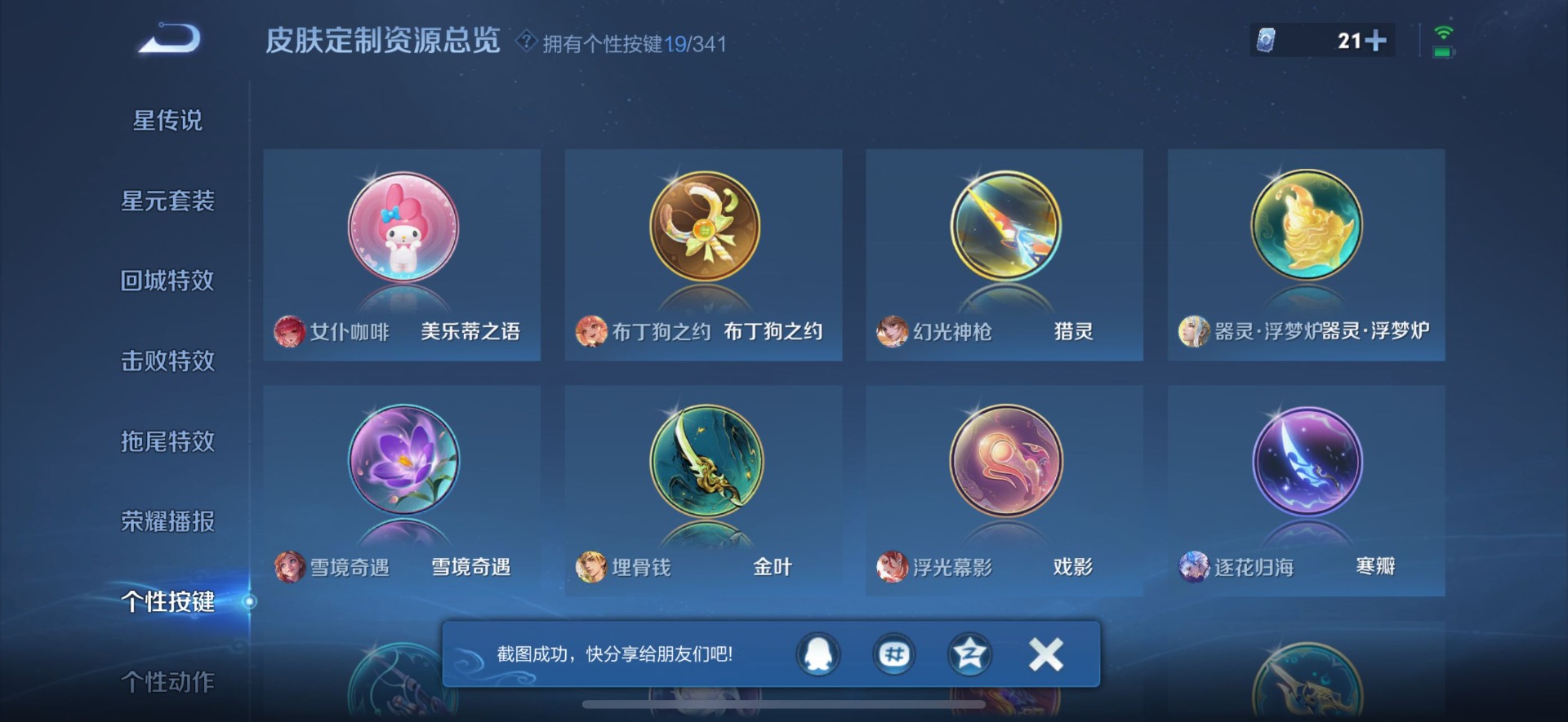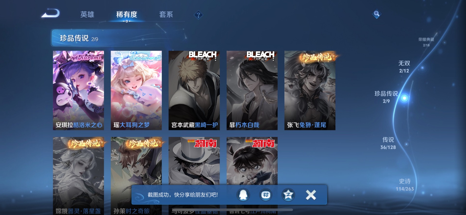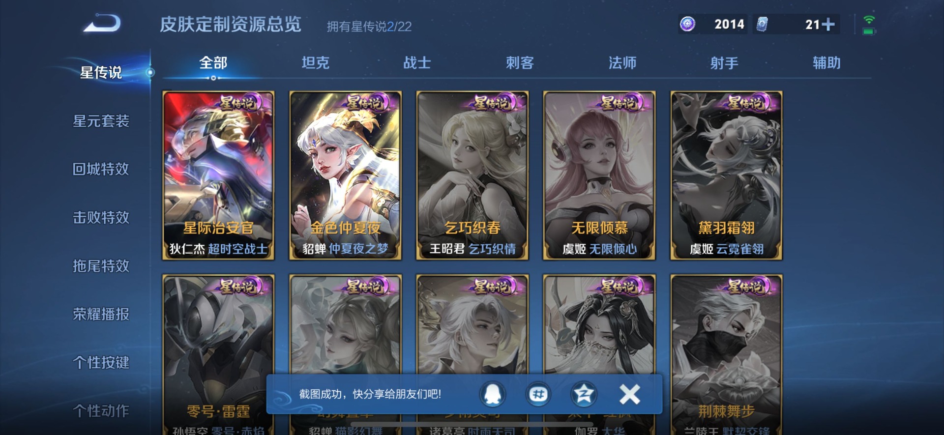 大乔白鹤梁神女,夏侯惇霜北刀,廉颇寅虎·御盾,伽罗天狼溯光者,干将莫邪冰霜恋舞曲,孙尚香异界灵契,不知火舞绯月行,吕布御风骁将,露娜一生所爱,诸葛亮时雨天司,兰陵王默契交锋,公孙离蜜橘之夏,裴擒虎天狼狩猎者,上官婉儿梁祝,上官婉儿神器·万象笔,李白诗剑行,花木兰默契交锋,桑启鸣野蒿,孙悟空孙行者,马超神威,妲己时之奇旅,韩信傲雪梅枪,百里守约朱雀志,虞姬霸王别姬,娜可露露前尘镜,王昭君星穹之声,关羽冰锋战神,橘右京枫霜尽
