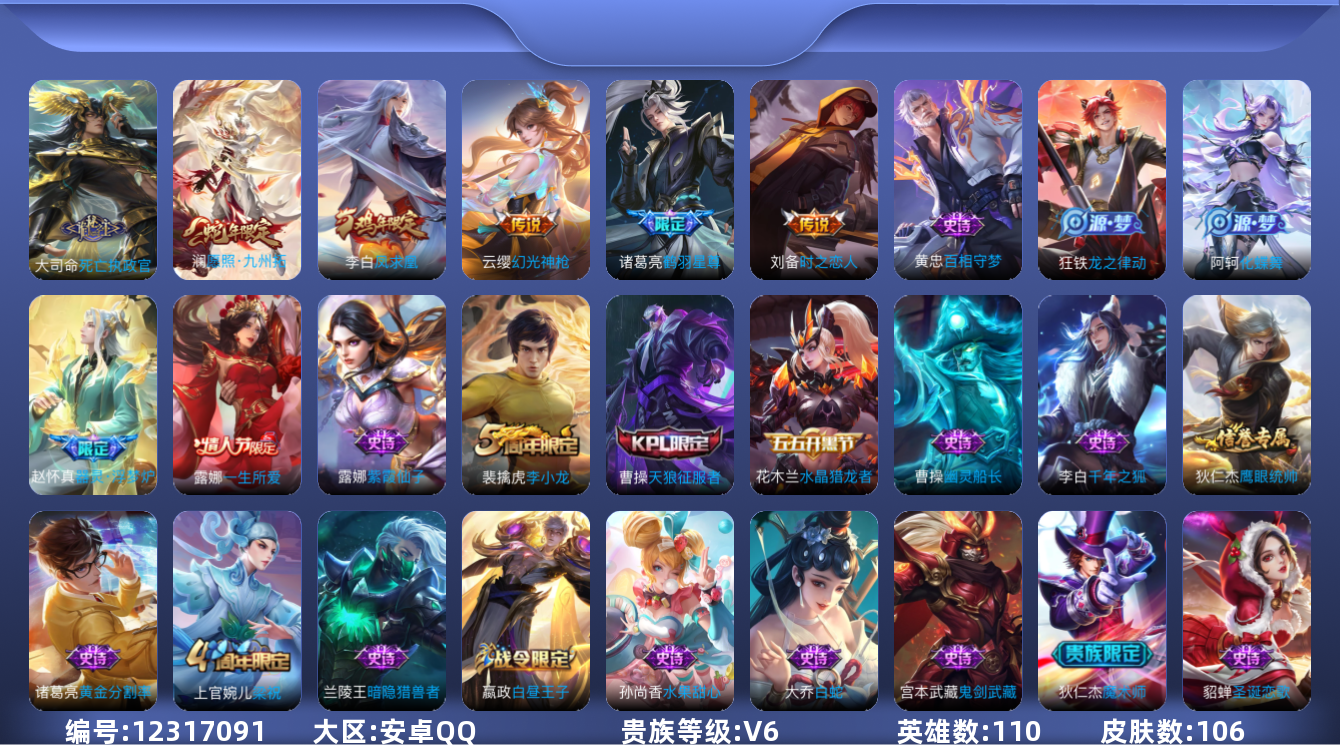 [12317091]V6 6传说 110英雄 106皮肤 可修改实名 优质装备:时之恋人-刘备(电焊工),鹤羽星尊 传说皮:死亡执政官,幻光神枪 限定皮:愿照·九州拓(澜年限),凤求凰(白切鸡),梁祝,天狼征服者,李小龙,一生所爱 史诗皮:器灵·浮梦炉,化蝶舞,龙之律动,百相守梦-黄忠,紫霞仙子,黄金分割率,千年之狐,白蛇,水果甜心,暗隐猎兽者,幽灵船长,鬼剑武藏,水晶猎龙者,圣诞恋歌,鹰眼统帅