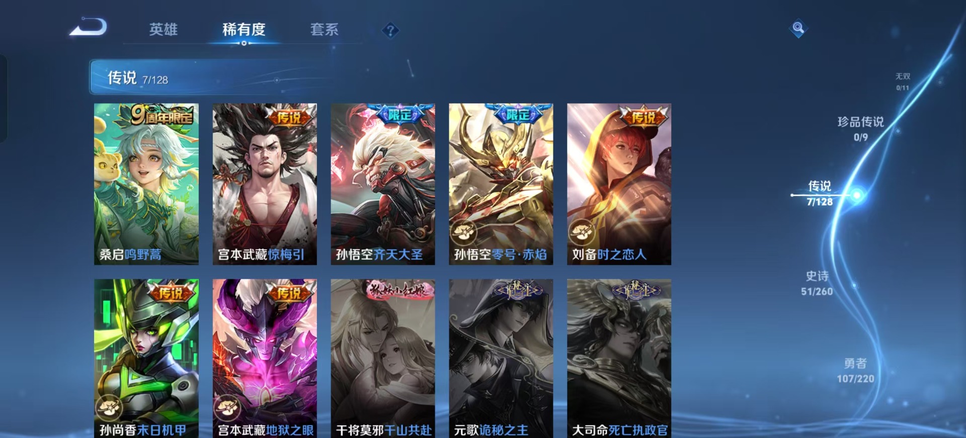 - [12313840]V7 1典藏 6传说 122英雄 268皮肤 可修改实名 优质装备:九霄神辉(木兰典藏),冠军飞将,地狱火,地狱之眼,超时空战士-狄仁杰 珍宝阁皮:蔷薇恋人,女武神 限定皮:鸣野蒿,白虎志(电光耗子),遇见飞天,高山流水,青龙志(铠年限),游园惊梦,梁祝,逐梦之星,李小龙,逐梦之影,圣诞老人,默契交锋-花木兰,猪悟能,大圣娶亲,引擎之心 史诗皮:星界战将,蒙犽顽岩魄,百相守梦-黄忠,苍穹之光,电玩小子(小书包),黄金分割率,特工魅影,千年之狐,蒙恬荣光圣徽,冰冠公主,暗夜猫娘,猫狗日记-孙策,乱世虎臣,女仆咖啡,摇滚巨星,水果甜心,星夜王子,心灵骇客,功夫厨神,德古拉伯爵,暗隐猎兽者,幽灵船长,鬼剑武藏,心灵战警,舞动绿茵,地狱岩魂,乘风破浪,逐浪之夏,水晶猎龙者,曙光守护者,金属风暴,原初追逐者,圣诞狂欢,圣诞恋歌,鹰眼统帅,王者之锤,黎明之约,未来纪元-赵云