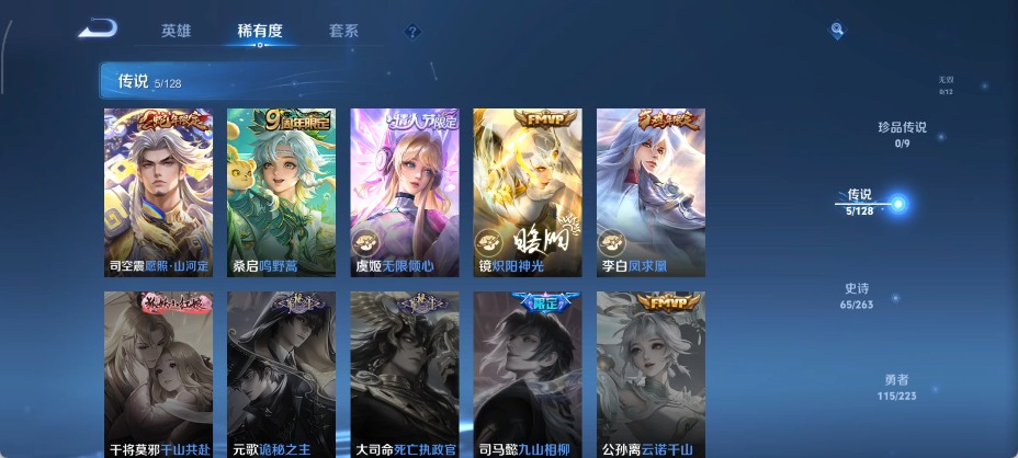- [11606596]V5 3传说 123英雄 112皮肤 可修改实名 优质装备:澜逐花归海 传说皮:乘龙·铭钟鼎(赵云年限) 珍宝阁皮:蔷薇恋人 限定皮:鸣野蒿,高山流水 史诗皮:器灵·浮梦炉,蒙犽顽岩魄,黄金分割率,特工魅影,江河有灵,高渐离燃音魔法,末日机甲-吕布,女仆咖啡,摇滚巨星,水果甜心,鬼剑武藏,舞动绿茵,拒霜思,缤纷独角兽,乘风破浪,逐浪之夏,曙光守护者,唤灵魅影,金属风暴,鹰眼统帅,魅力维加斯