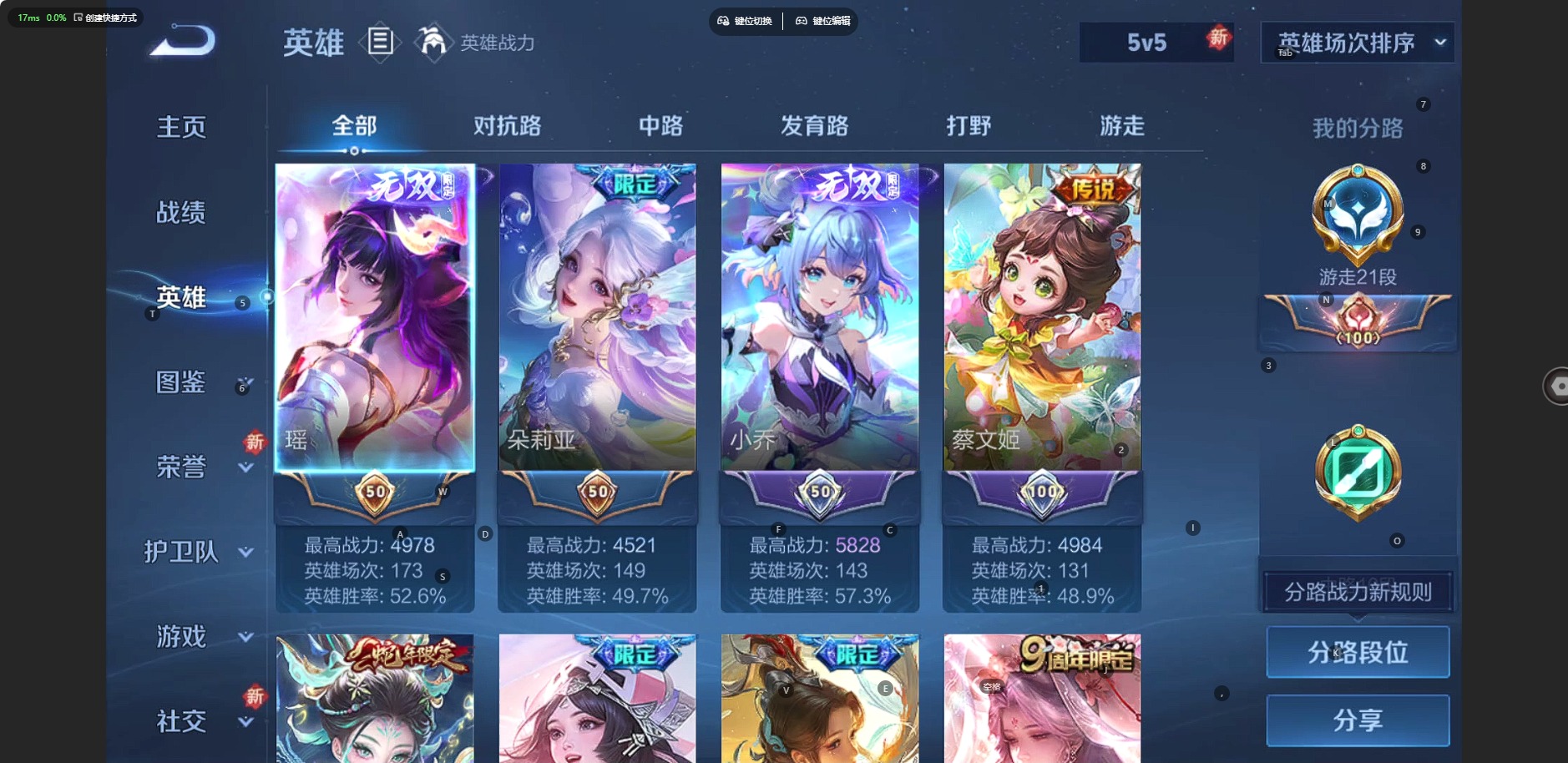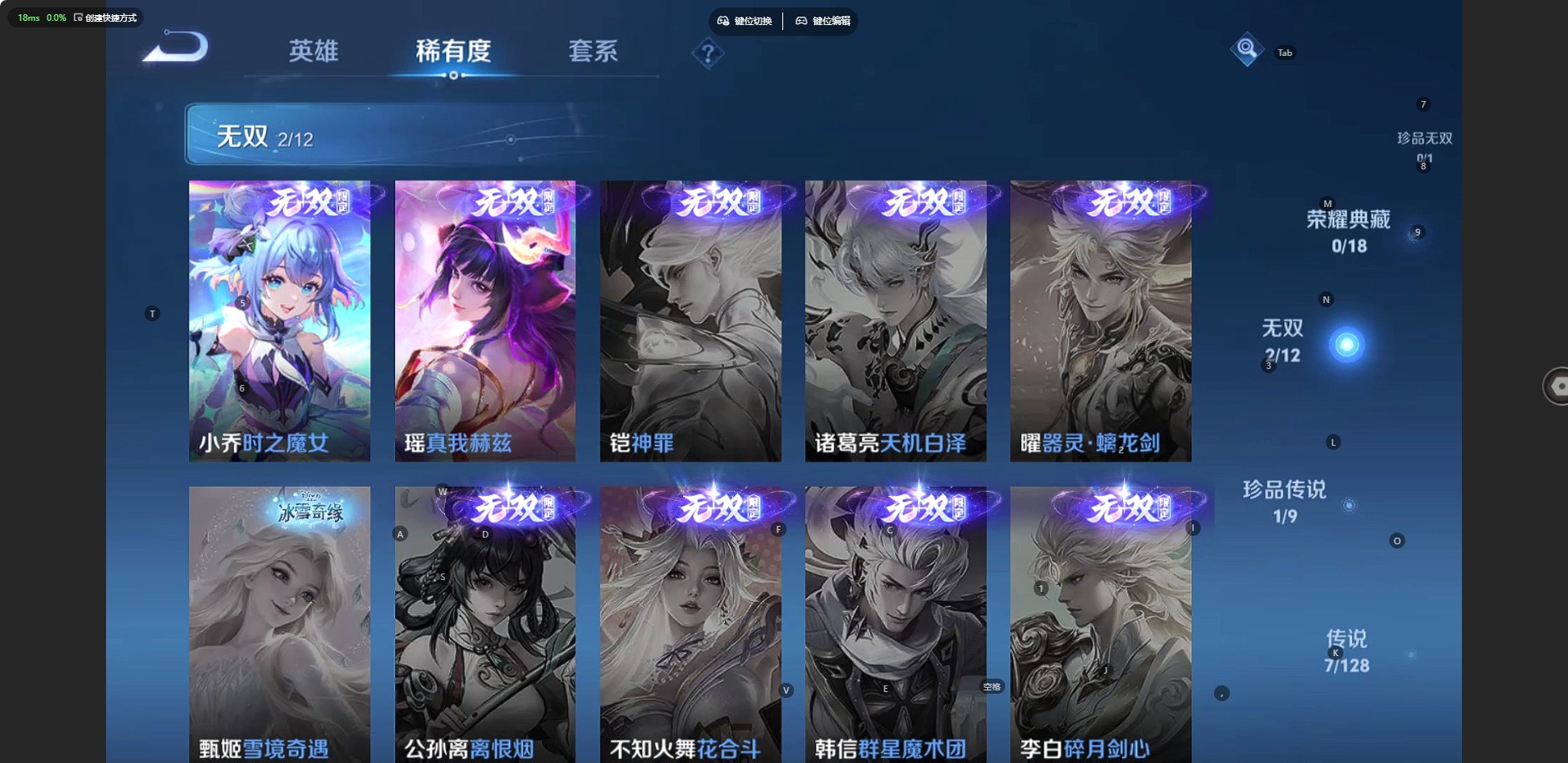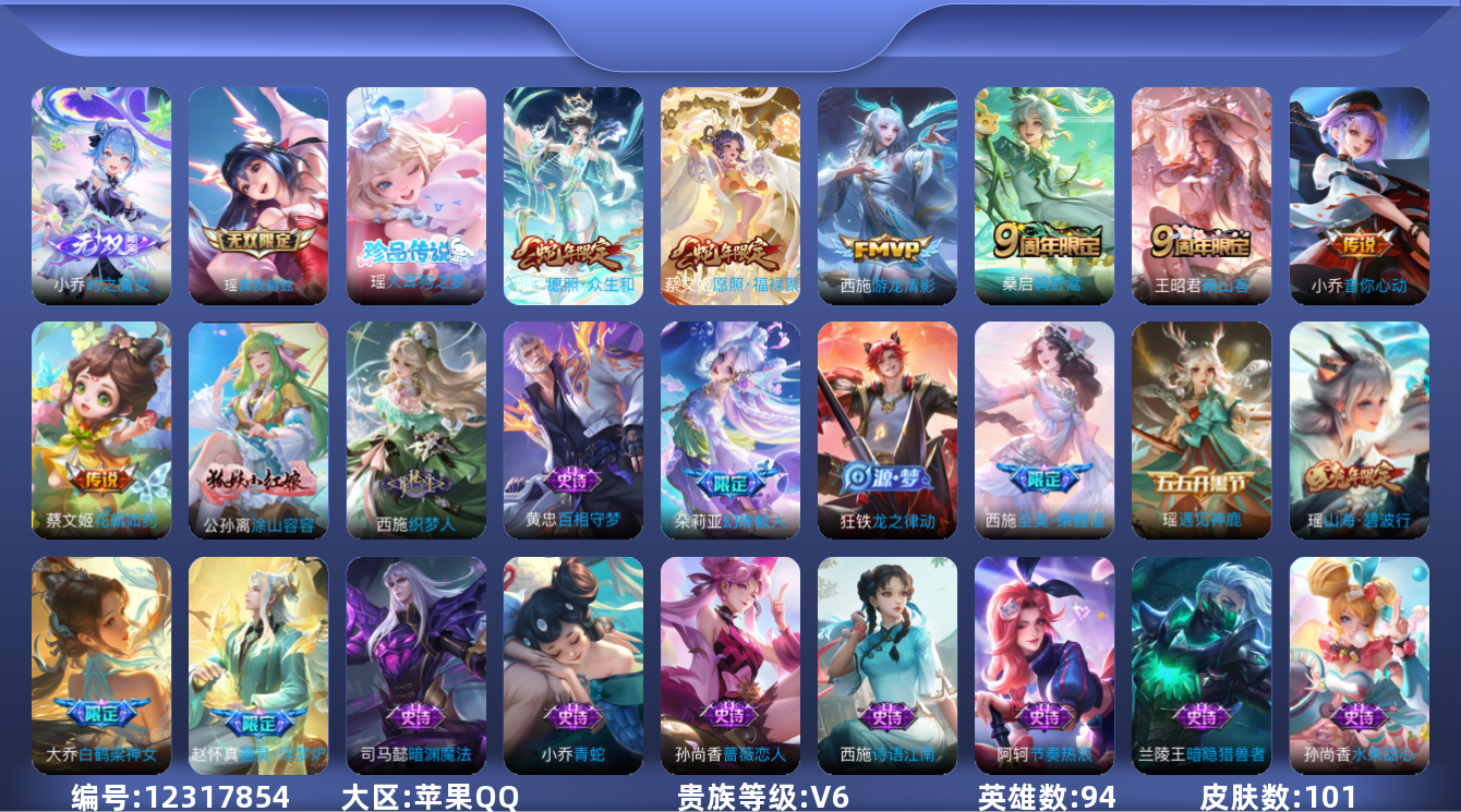 [12317854]V6 2无双 1珍品传说 7传说 94英雄 101皮肤 可修改实名 优质装备:真我赫兹(瑶)(瑶无双),小乔时之魔女(小乔无双),大耳狗之梦,音你心动-小乔,游龙清影(小青龙),花朝如约(花篮子),涂山容容 珍宝阁皮:蔷薇恋人 限定皮:愿照·福禄聚(蔡文姬年限),愿照·众生和(妲己年限),映山客,鸣野蒿,白鹤梁神女,山海·碧波行(瑶年限),至美·乘鲤谣 史诗皮:器灵·浮梦炉,龙之律动,幻珠鲛人,蒙犽顽岩魄,百相守梦-黄忠,织梦人,遇见神鹿,白蛇,青蛇,节奏热浪,水果甜心,暗隐猎兽者,鬼剑武藏,暗渊魔法,舞动绿茵,诗语江南,魅力维加斯,滕王阁序