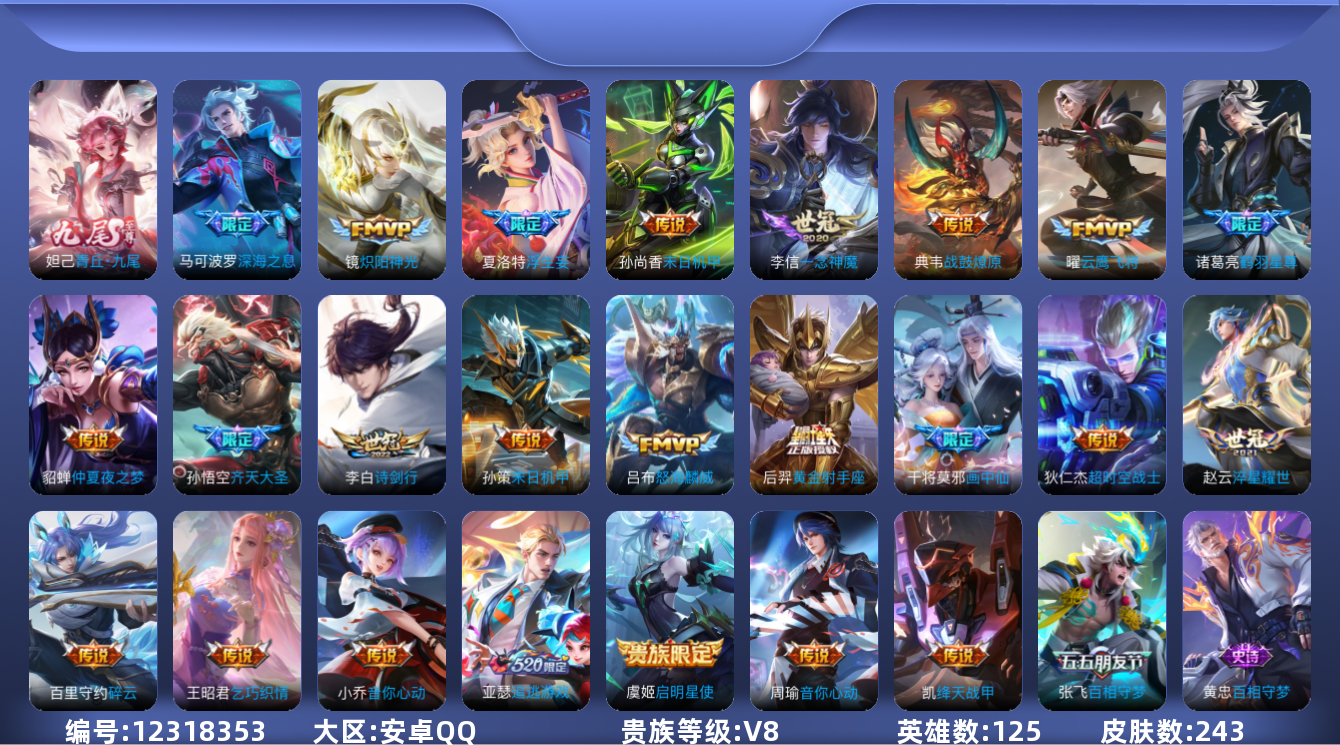 [12318353]【商品标题】:安卓Q-V8-最强王者段位-125英雄-243皮肤-0典藏-0珍品无双-1无双-0珍品传说-25传说-64史诗