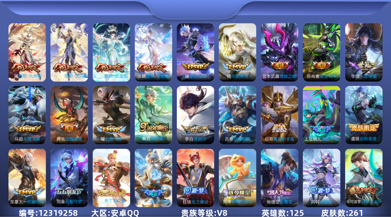 - [12381746]【商品标题】:安卓Q-V5-至尊星耀III段位-123英雄-189皮肤-0典藏-0珍品无双-0无双-0珍品传说-2传说-42史诗 【内测皮肤】:孙尚香蔷薇恋人,高渐离玩趣恶龙,狂铁特工战影 【传说皮肤】:孙尚香末日机甲,桑启鸣野蒿 【限定皮肤】:蔡文姬夏日便利店,虞姬夏日便利店,姜子牙天穹之誓,狄仁杰阴阳师,赵云皇家上将,赵云引擎之心,孙尚香蔷薇恋人,高渐离玩趣恶龙,钟无艳超时空战士,夏侯惇朔风刀,甄姬游园惊梦,甄姬落雪兰心,狄仁杰魔术师,狄仁杰万华元夜,达摩星际陆战队,达摩沙漠行僧,项羽海滩派对,老夫子醍醐杖,关羽冰锋战神,程咬金演武夺筹,兰陵王金庭之子,牛魔御旌,李元芳云中旅人,钟馗驱傩正仪,雅典娜单词大作战,鬼谷子原初探秘者,鬼谷子五谷丰年,苏烈千军破阵,弈星混沌棋,沈梦溪大漠名商,明世隐疑决卦,裴擒虎李小龙,裴擒虎擒涛扼浪,米莱狄御霄,米莱狄胡桃异想国,盾山御銮,猪八戒西部大镖客,上官婉儿梁祝,嫦娥拒霜思,蒙犽狂想玩偶喵,桑启海盐诗旅,阿古朵江河有灵,张良古海寻踪,鬼谷子天穹祈灯,刘邦剑破天穹,周瑜熔金海岸 【赛季限定】:夏侯惇朔风刀,狄仁杰万华元夜,达摩沙漠行僧,老夫子醍醐杖,程咬金演武夺筹,兰陵王金庭之子,张良古海寻踪,牛魔御旌,李元芳云中旅人,钟馗驱傩正仪,鬼谷子原初探秘者,苏烈千军破阵,弈星混沌棋,沈梦溪大漠名商,明世隐疑决卦,裴擒虎擒涛扼浪,米莱狄御霄,盾山御銮,桑启海盐诗旅,鬼谷子天穹祈灯,刘邦剑破天穹,姜子牙天穹之誓 【战令限定】:蔡文姬夏日便利店,虞姬夏日便利店,钟无艳超时空战士,甄姬落雪兰心,达摩星际陆战队,雅典娜单词大作战,米莱狄胡桃异想国,猪八戒西部大镖客,蒙犽狂想玩偶喵 【史诗皮肤】:露娜紫霞仙子,赵云皇家上将,赵云未来纪元,貂蝉圣诞恋歌,甄姬冰雪圆舞曲,王昭君偶像歌手,狄仁杰魔术师,孙尚香蔷薇恋人,孙尚香水果甜心,嬴政摇滚巨星,妲己女仆咖啡,墨子龙骑士,墨子金属风暴,吕布圣诞狂欢,张飞乱世虎臣,韩信白龙吟,关羽冰锋战神,赵云引擎之心,刘邦德古拉伯爵,夏侯惇乘风破浪,兰陵王暗隐猎兽者,甄姬游园惊梦,亚瑟心灵战警,雅典娜冰冠公主,百里守约特工魅影,李元芳逐浪之夏,程咬金功夫厨神,阿轲节奏热浪,孙策猫狗日记,狄仁杰鹰眼统帅,上官婉儿梁祝,大乔白蛇,不知火舞魅语,蒙犽狂想玩偶喵,裴擒虎李小龙,米莱狄胡桃异想国,嫦娥拒霜思,钟无艳超时空战士