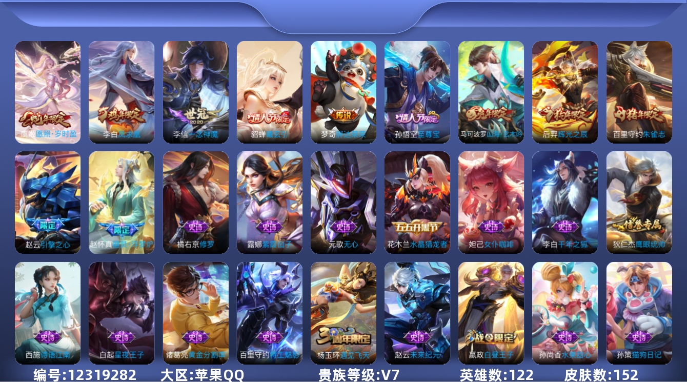 [12319282]V7 5传说 122英雄 152皮肤 可修改实名 优质装备:一念神魔,胖达荣荣 传说皮:貂蝉曦玄引 限定皮:愿照·岁时盈(虞姬年限),至尊宝,凤求凰(白切鸡),遇见飞天,朱雀志(守约年限),辉光之辰,引擎之心,山海·玄木吟(马可年限) 史诗皮:器灵·浮梦炉,紫霞仙子,白龙吟,黄金分割率,特工魅影,千年之狐,猫狗日记-孙策,乱世虎臣,修罗,女仆咖啡,摇滚巨星,水果甜心,星夜王子,德古拉伯爵,地狱岩魂,诗语江南,逐浪之夏,水晶猎龙者,圣诞恋歌,鹰眼统帅,魅力维加斯,无心,未来纪元-赵云
