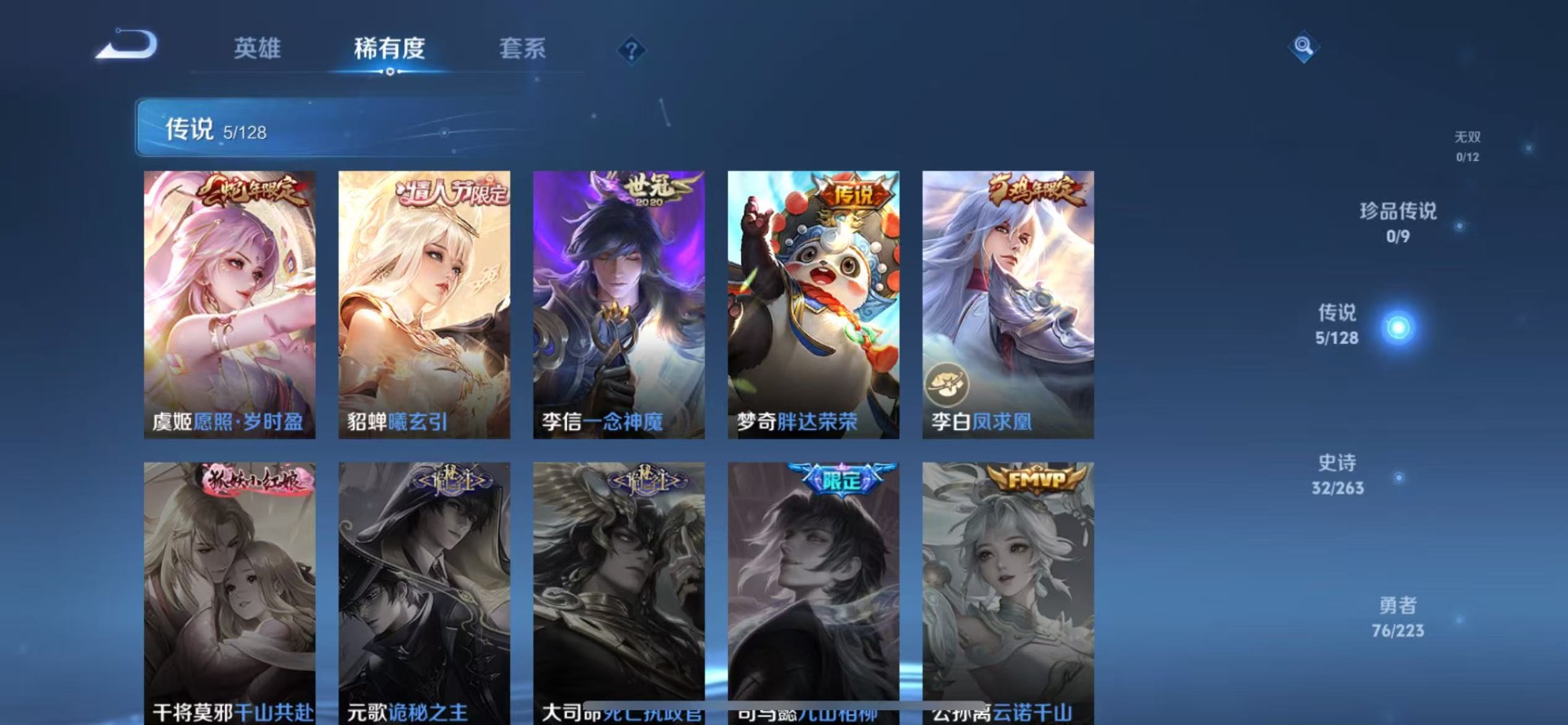 夏侯惇朔风刀,老夫子醍醐杖,盾山御銮,曹操烛龙,孙膑妖精王,典韦穷奇,牛魔御旌,吕布猎兽之王,庄周蜃楼王,裴擒虎擒涛扼浪,鲁班大师探海日志,明世隐疑决卦,白起狰,鬼谷子原初探秘者,张良古海寻踪,桑启海盐诗旅,狄仁杰万华元夜,嬴政白昼王子,芈月重明,程咬金演武夺筹,扁鹊炼金王,李元芳云中旅人,弈星混沌棋,虞姬凯尔特女王,米莱狄御霄,钟馗驱傩正仪,狂铁御狮,太乙真人饕餮