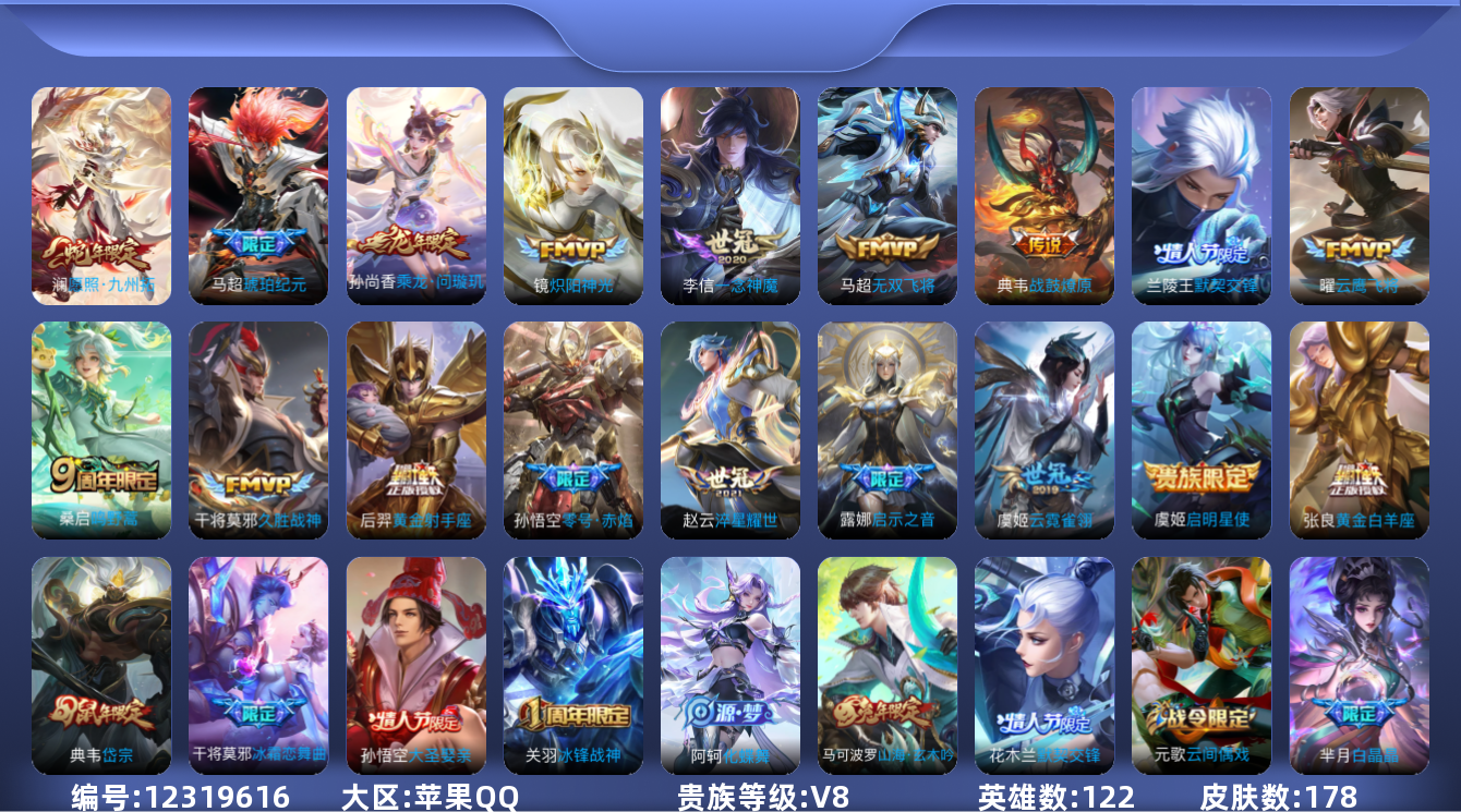 - [12293368]V8 5典藏 1珍品传说 15传说 124英雄 356皮肤 可修改实名 优质装备:天鹅之梦(小乔典藏),鸣剑·曳影,星域神启(倪克斯贼亮),银白咏叹调(倪克斯侍卫),弑枪猎影(韩信典藏),江户川柯南,黄金射手座,猫影幻舞,炽阳神光,一念神魔,末日机甲-孙尚香(绿蚂蚱),仲夏夜之梦(大飞蛾),零号·赤焰,时之恋人-刘备(电焊工),超时空战士-狄仁杰,遇见胡旋,山海·炽霜斩(李信年限),画中仙 珍宝阁皮:女武神,玩趣恶龙 限定皮:逐霄战戟,鸣野蒿,至尊宝,异界灵契(白毛香),傲雪梅枪,魔法小厨娘,神威(电光马子),高山流水,游园惊梦,梁祝,御风骁将(吕布年限),李小龙,朱雀志(守约年限),真爱至上,孙行者,大圣娶亲,引擎之心,云端筑梦师,山海·玄木吟(马可年限),冰霜神祇 史诗皮:化蝶舞,龙之律动,灵蛊蚀心,星界战将,石田雨龙,百相守梦-黄忠,破空之剑,怒海争锋,蔬乡物语(鲁班七号),紫霞仙子,苍穹之光,电玩小子(小书包),白龙吟,黄金分割率,特工魅影,千年之狐,永昼,冰冠公主,江河有灵,雪夜绮愿(周瑜),青蛇,百解令(蒙犽),高渐离燃音魔法,蒙恬荣光圣徽,电玩·爆裂旋风,偶像歌手,匿光破解者,龙骑士(小龙虾),暗夜猫娘,末日机甲-吕布,猫狗日记-孙策,猫狗日记-大乔,乱世虎臣,节奏热浪,修罗,女仆咖啡,摇滚巨星,水果甜心,绅士熊喵,天才门将,星夜王子,心灵骇客,功夫厨神,德古拉伯爵,暗隐猎兽者,幽灵船长,鬼剑武藏,心灵战警,舞动绿茵,地狱岩魂,纤云弄巧,繁星吟游(呼啦呼啦),拒霜思,缤纷独角兽,乘风破浪,逐浪之夏,水晶猎龙者,曙光守护者,箭羽风息,金属风暴,原初追逐者,圣诞狂欢,圣诞恋歌,鹰眼统帅,王者之锤,暗夜贵公子,魅力维加斯,黎明之约,无心,未来纪元-赵云