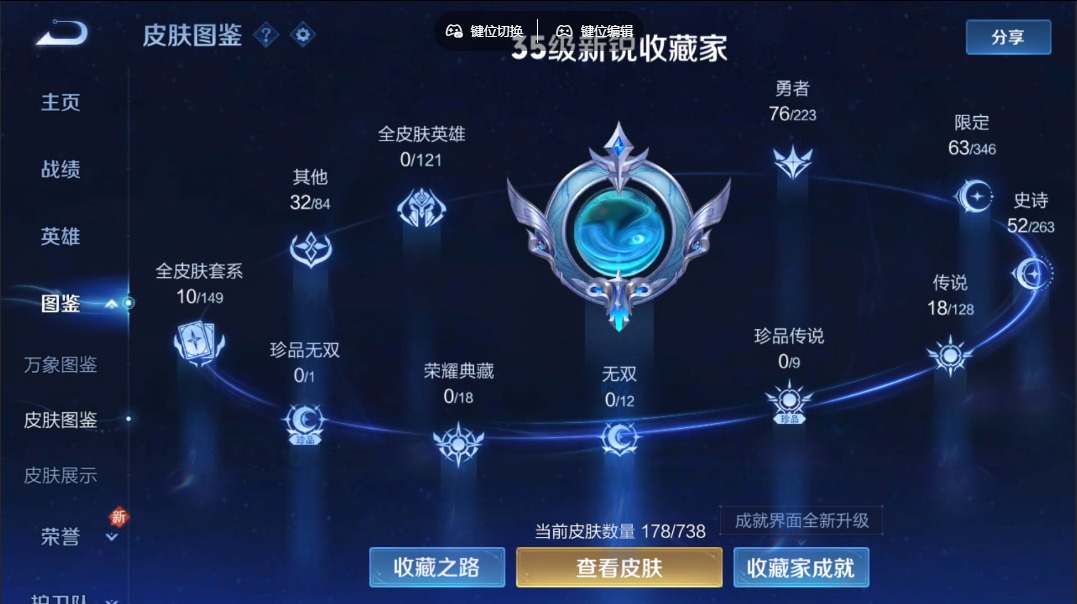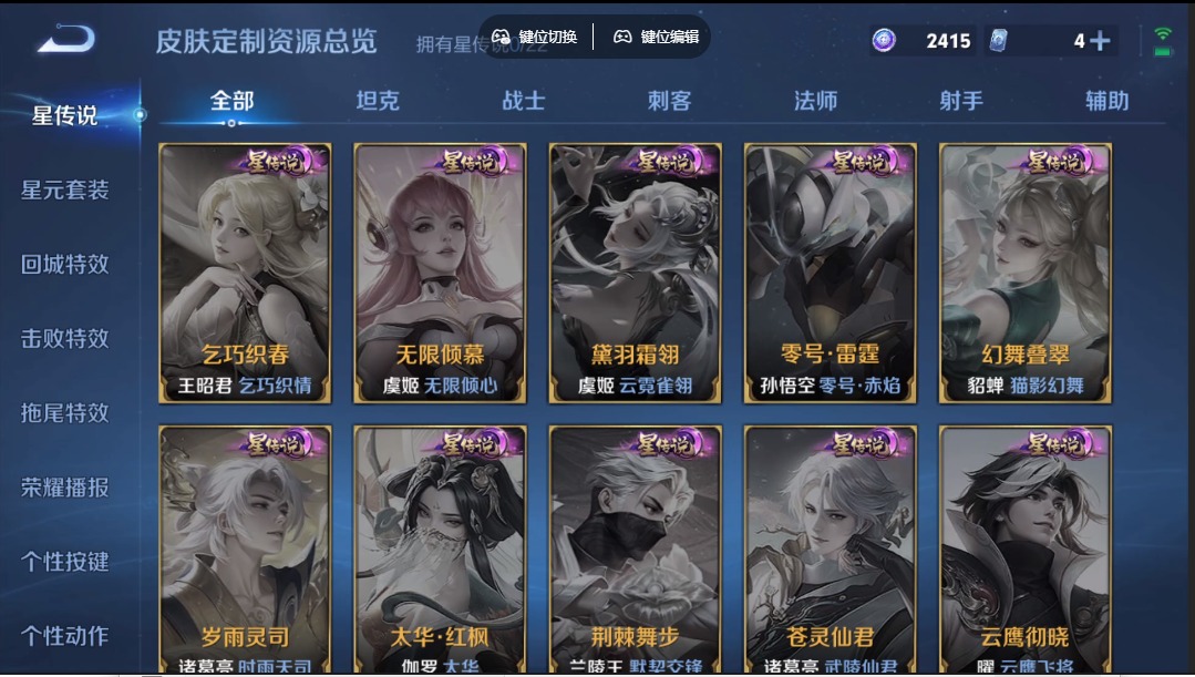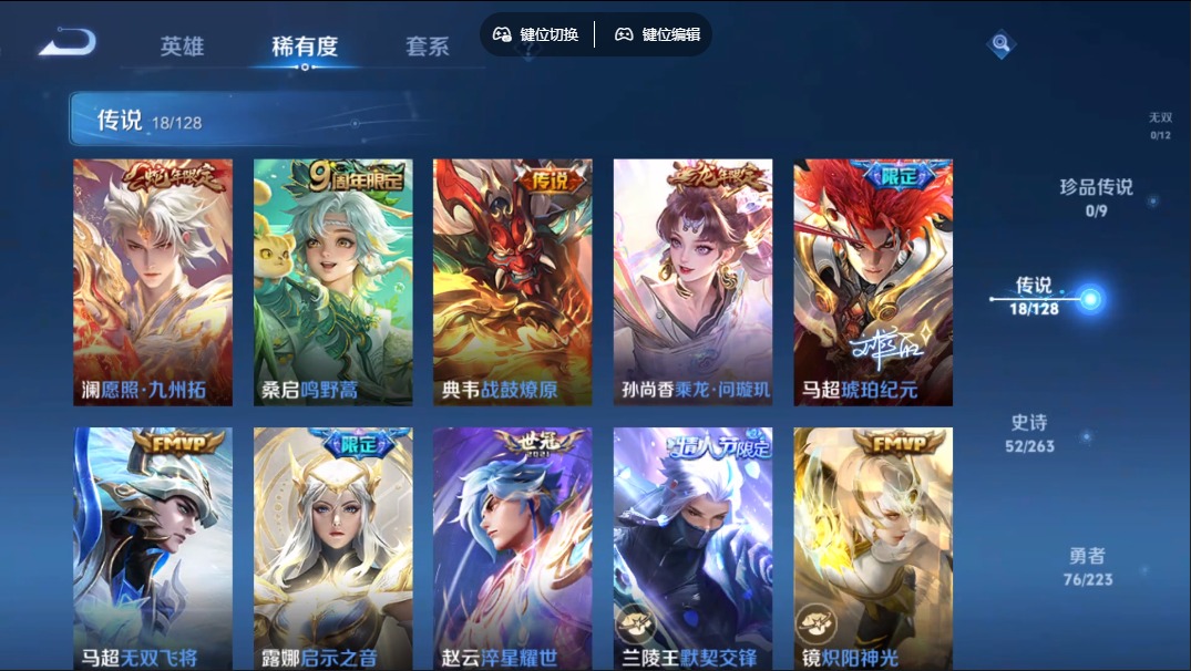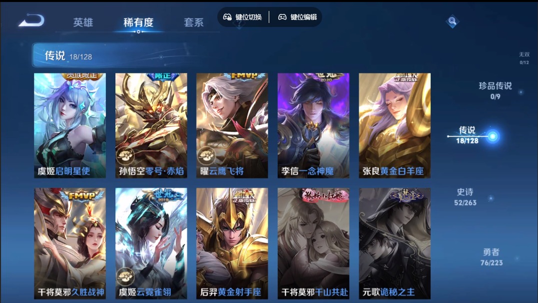 - PX_2074605-35 安卓QQ/至尊星耀/203皮肤/123英雄/3典藏/0珍品无双/1无双/1珍品传说/16传说/65史诗/8稀有英雄 【1 珍品传说】时之奇旅 孙策, 【3 典藏皮肤】全息碎影 孙悟空,银白咏叹调 铠,最初的交响 伽罗, 【1 无双皮肤】器灵·螭龙剑 曜, 【16 传说皮肤】胖达荣荣 梦奇,启明星使 虞姬,零号·赤焰 孙悟空,地狱火 孙悟空,猫影幻舞 貂蝉,久胜战神 干将