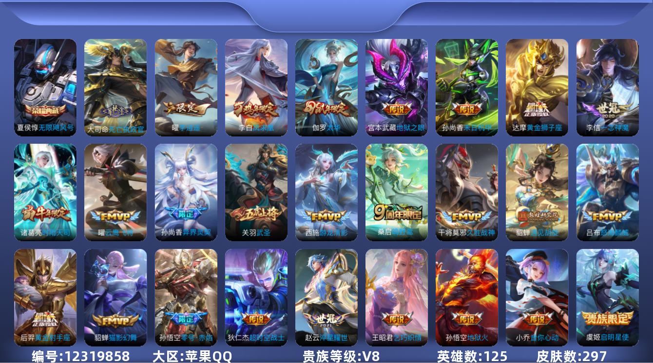 - [11601515]V7 1典藏 1珍品传说 11传说 123英雄 215皮肤 可修改实名 优质装备:幻阙歌(貂蝉典藏),怪盗基德,一念神魔,仲夏夜之梦(大飞蛾),无双飞将,鲁班七号-时之奇旅 传说皮:乘龙·淬吴钩(孙策年限),云诺千山,幻光神枪 珍宝阁皮:妄想食味,蔷薇恋人 限定皮:愿照·九州拓(澜年限),鸣野蒿,绯月行,时雨天司(水龙头),五谷丰年,梁祝,御风骁将(吕布年限),天狼溯光者,李小龙,孙行者,玉兔公主 史诗皮:器灵·浮梦炉,龙之律动,雪豹·霜爪,破空之剑,百相守梦-黄忠,特工魅影,电玩·爆裂旋风,江河有灵,百解令(蒙犽),偶像歌手,冰冠公主,猫狗日记-孙策,时之恋人-孙尚香,节奏热浪,修罗,女仆咖啡,水果甜心,天才门将,星夜王子,心灵骇客,幽灵船长,鬼剑武藏,舞动绿茵,纤云弄巧,乘风破浪,逐浪之夏,水晶猎龙者,曙光守护者,金属风暴,鹰眼统帅,赏金猎手,滕王阁序,无心,未来纪元-赵云