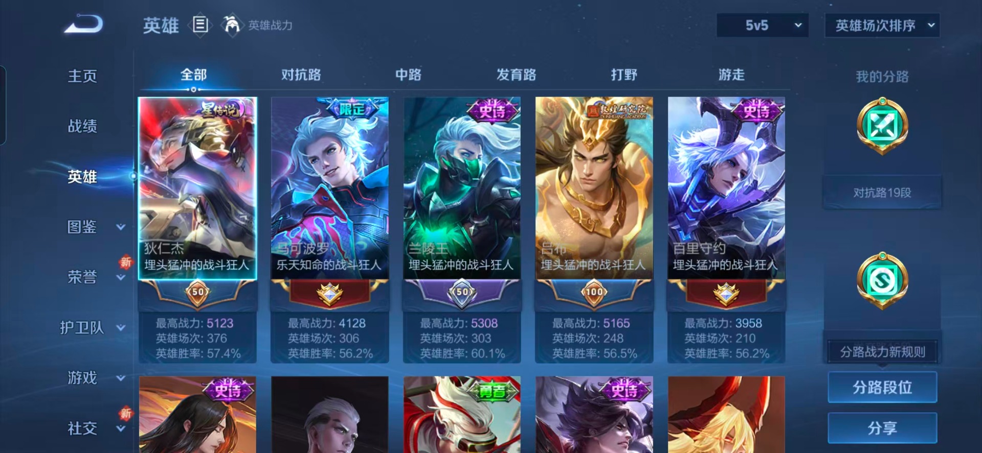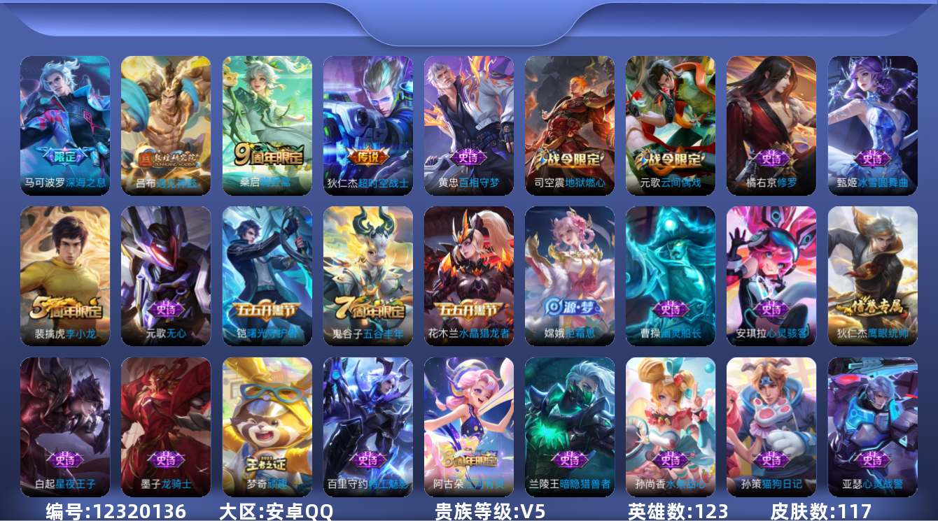 [12320136]V5 4传说 123英雄 117皮肤 可修改实名 优质装备:超时空战士-狄仁杰,遇见神鼓 珍宝阁皮:玩趣恶龙 限定皮:鸣野蒿,五谷丰年,李小龙,深海之息(深海大菠萝) 史诗皮:百相守梦-黄忠,特工魅影,江河有灵,龙骑士(小龙虾),百解令(蒙犽),蒙恬荣光圣徽,冰冠公主,猫狗日记-孙策,乱世虎臣,修罗,水果甜心,绅士熊喵,星夜王子,心灵骇客,功夫厨神,暗隐猎兽者,幽灵船长,鬼剑武藏,心灵战警,拒霜思,水晶猎龙者,曙光守护者,金属风暴,鹰眼统帅,魅力维加斯,无心