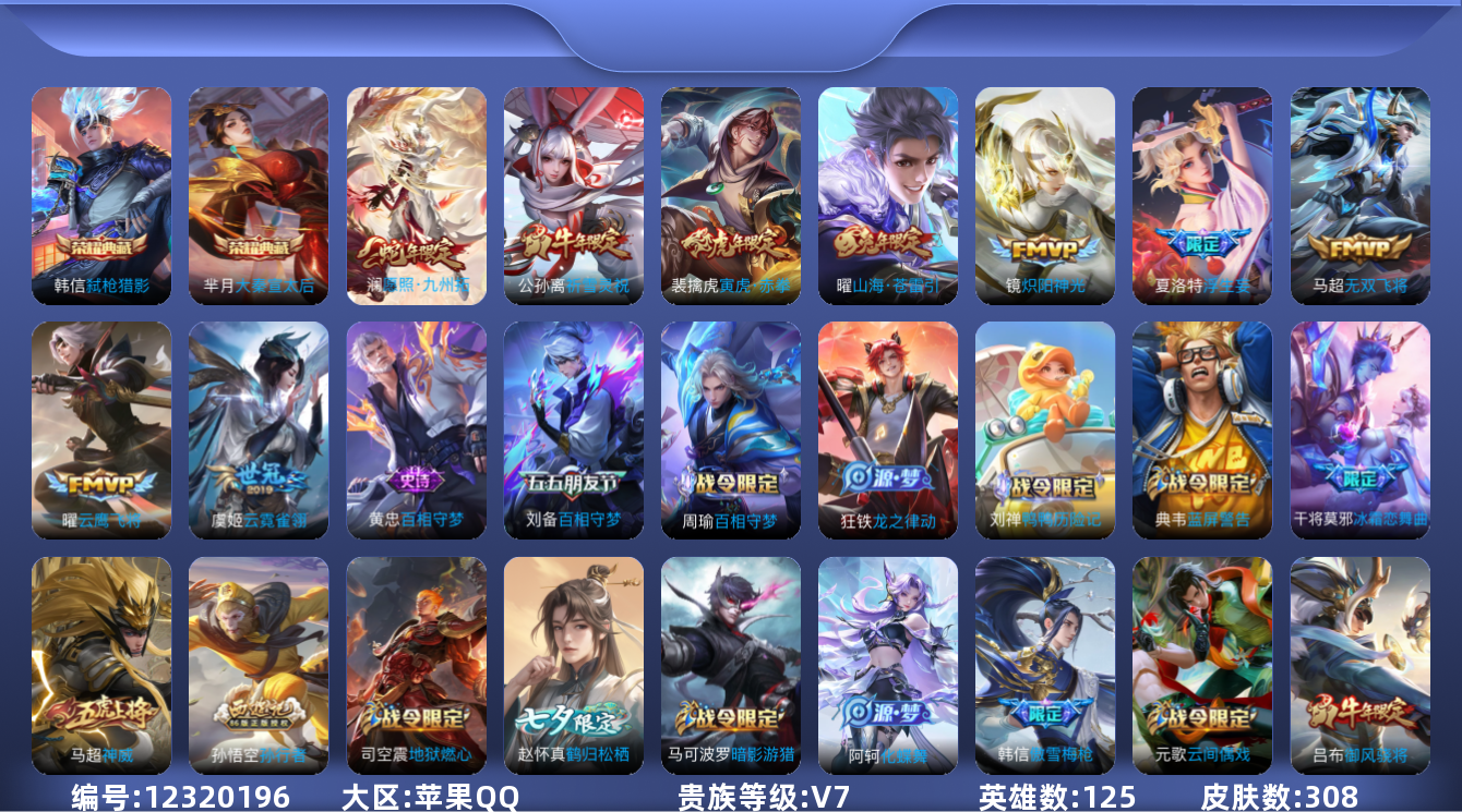 [12320196]【商品标题】:苹果Q-V7-最强王者段位-125英雄-308皮肤-2典藏-0珍品无双-0无双-0珍品传说-9传说-84史诗