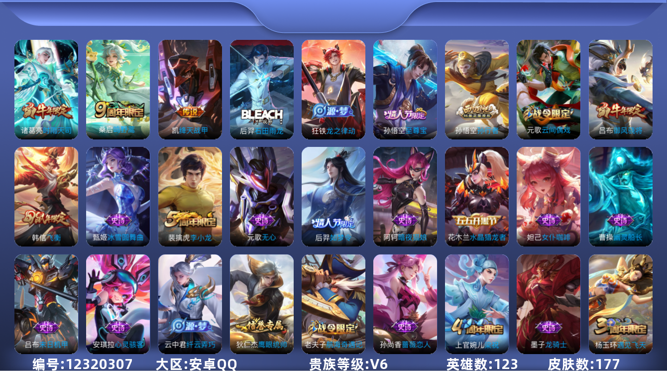 - PX_2095048-实名: 可修改 贵族等级: V5 英雄数: 63 皮肤数: 43 传说皮: 典韦战鼓燎原
