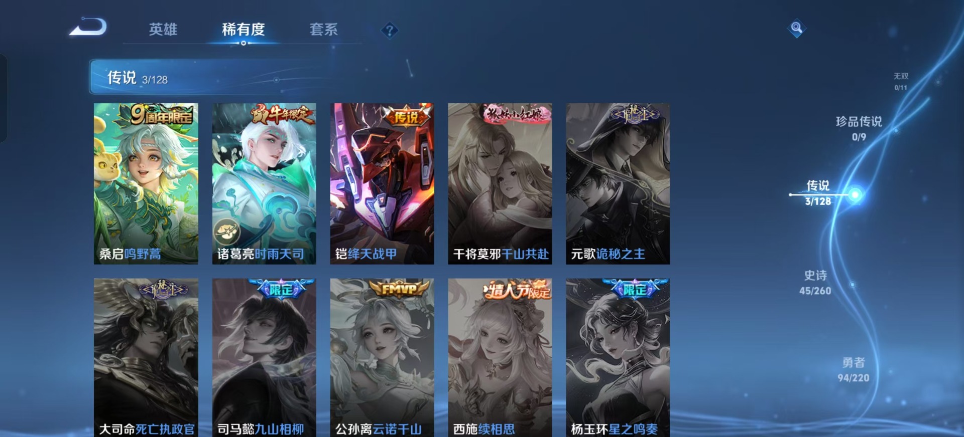 [12320307]V6 3传说 123英雄 177皮肤 可修改实名 优质装备:绛天战甲(鸡嘴战神) 珍宝阁皮:蔷薇恋人,玩趣恶龙 限定皮:鸣野蒿,至尊宝,时雨天司(水龙头),飞衡(韩信年限),遇见飞天,梁祝,御风骁将(吕布年限),李小龙,如梦令-后羿,孙行者 史诗皮:龙之律动,石田雨龙,江河有灵,百解令(蒙犽),冰冠公主,暗夜猫娘,龙骑士(小龙虾),末日机甲-吕布,猫狗日记-孙策,乱世虎臣,节奏热浪,女仆咖啡,水果甜心,心灵骇客,功夫厨神,德古拉伯爵,幽灵船长,心灵战警,地狱岩魂,纤云弄巧,繁星吟游(呼啦呼啦),缤纷独角兽,水晶猎龙者,圣诞狂欢,圣诞恋歌,鹰眼统帅,无心,未来纪元-赵云