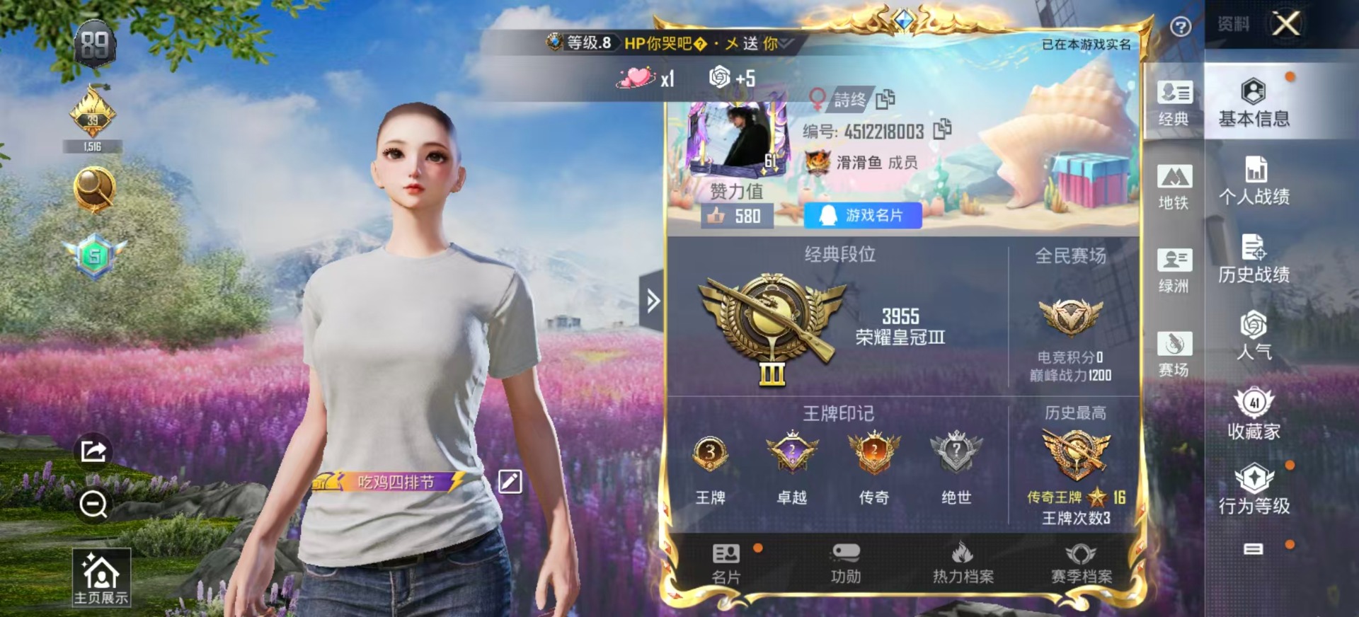 - [10565361]实名: 可修改 时装数: 447 载具数: 1 枪械数: 187 战备数: 102 热门装扮: 梦魇先生,橘柚倾心,傲雪凌霜,兔兔白日梦,莲影清波,罗征 载具: 玛莎拉蒂Quattroporte(夜幕蓝) 稀有枪皮: M416风花雪月,SCAR-L青春物语,Kar98K-巳巳如意
