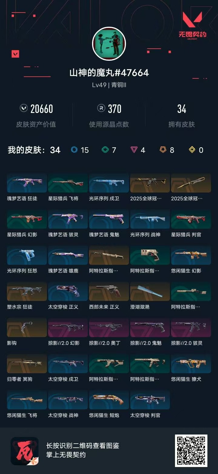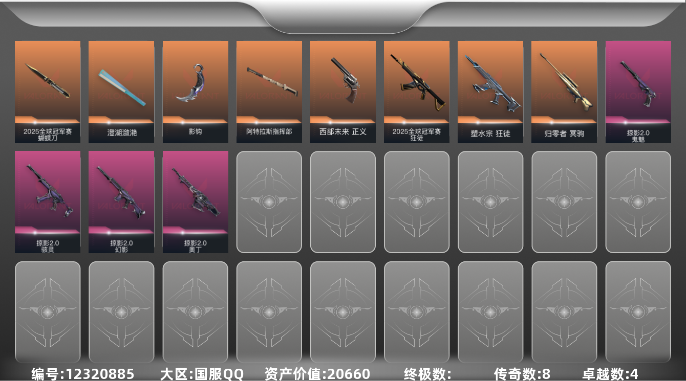 [12320885]8橙皮 4紫皮 34皮肤 15英雄 61卡面 370已用源晶 青铜 优质装备:2025全球冠军赛 蝴蝶刀,冥驹-归零者,狂徒-塑水宗,澄湖潋滟,阿特拉斯指挥部,影钩,2025全球冠军赛 狂徒 套装:掠影2.0套装 佩枪皮肤:鬼魅-掠影2.0,正义-西部未来 冲锋枪皮肤:骇灵-掠影2.0 步枪皮肤:幻影-掠影2.0 机枪皮肤:奥丁-掠影2.0