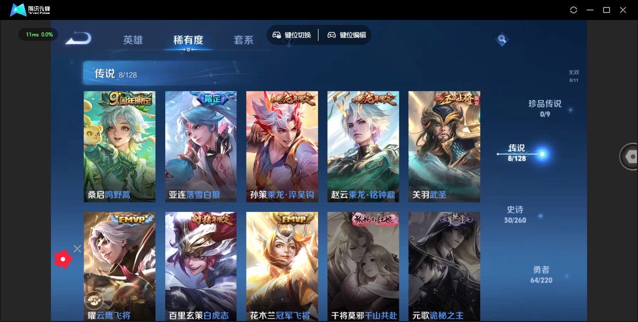 [12321065]V7 8传说 122英雄 134皮肤 可修改实名 嬴政大国标 关羽小国标 苍小国标 优质装备:冠军飞将,云鹰飞将(小将军) 传说皮:乘龙·铭钟鼎(赵云年限),乘龙·淬吴钩(孙策年限),落雪白狼 珍宝阁皮:优雅恋人 限定皮:逐霄战戟,鸣野蒿,白虎志(电光耗子),白鹤梁神女,遇见飞天,武圣,梁祝,李小龙 史诗皮:怒海争锋,决胜骁骑,特工魅影,千年之狐,江河有灵,龙骑士(小龙虾),乱世虎臣,修罗,摇滚巨星,水果甜心,鬼剑武藏,缤纷独角兽,月团寄思,原初追逐者,鹰眼统帅,暗夜贵公子,魅力维加斯,黎明之约