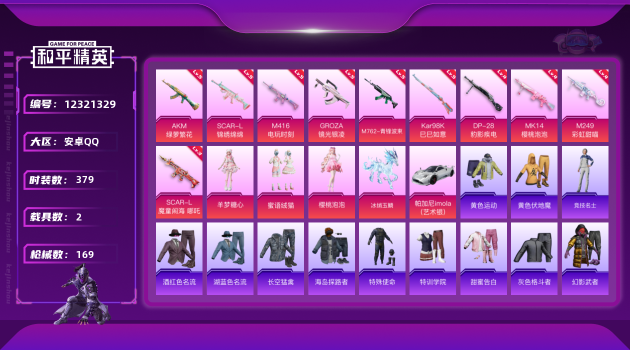 [12321329]3粉装 10特效枪 2载具 5印记 可二次 可修改实名 优质装备:帕加尼imola(艺术银),M249彩虹甜喵(M249-彩虹甜喵),AKM绿萝繁花,SCAR-L-锦绣绵绵,M416电玩时刻,M762-青锋波束,GROZA-镜光银凌,樱桃泡泡,MK14-樱桃泡泡,羊梦糖心,Kar98K-巳巳如意 热门装扮:蜜语绒猫 载具:冰绡玉鳞 稀有枪皮:SCAR-L-魔童闹海 哪吒,DP-28-豹影疾电 五级特效枪:五级M762-青锋波束,五级GROZA-镜光银凌,五级Kar98K-巳巳如意,五级M416-电玩时刻,五级SCAR-L-锦绣绵绵,五级AKM-绿萝繁花 四级特效枪:四级DP-28-豹影疾电,四级MK14-樱桃泡泡,四级M249-彩虹甜喵 三级特效枪:三级SCAR-L-魔童闹海 哪吒 紫色装扮:SS23特训,SS31特训套装,雪绒豹,SS33特训套装,青涩时光,SS21特训,田园牧歌,轻风白浪,SS22特训,吉莉礼服,幻世战舞者,幻影武者,冰川特警,萌趣咩咩,娇憨猪猪,星辰守护者,SS16特训,SS17特训,SS14特训,SS15特训,SS20特训,醇脆可可,甜心亚梦,虚音幻奏,SS18特训,SS19特训,魅力单车,麻辣教官,黄色伏地魔,黄色运动,龙的传人,龟仙人,冰河战士,龙魂突击队,蝶变,霓虹街区,都市漫游者,酒红色名流,长空猛禽,绛羽幽主,湖蓝色名流,灰色格斗者,牛气冲天,牛气满满,海岛探路者,柠萌假日,竞技达人朋克,缤纷果语,耀眼新星,蓝彩潮人,虎虎生威吉莉,特殊使命,特训学院,王牌教练,甜蜜告白,空岛之星,疯狂小兔子,破晓战魂,破蛋小黄鸡,福星高照,萝兰蝴蝶,SS29特训,雏菊兔兔,SS28特训,湖畔霞光,鱼渊荷华,玉兔迎春,燕燕于飞,巳巳如意,海琴烟,竞技名士,惊鸿侠骨,SS24特训(SS24特训套装),SS25特训,元气发射,锦衣飞扬,冰公主,SS27特训,菲菲,焰鹰斗篷,幻羽潜行,幽夜迷踪,晨曦薄雾,SS26特训,春光漫游,快闪甜心,贝斯之夜,智慧之神,风华少年志,SS12特训,SS13特训,耀粉歌者,SS32特训服(SS32特训套装),青玉碎影,蓝冰羽,绯格组合,萌黄之夏,紫幽梦,蜜桃派对,新风雅兰,银月精灵 优质战备:圣堂之誓降落伞,精灵梦叶罗丽降落伞,电糖天使降落伞,忍者神龟降落伞,圣斗士星矢降落伞,喜羊羊与灰太狼降落伞,飞天猪飞行器,鬼刀降落伞