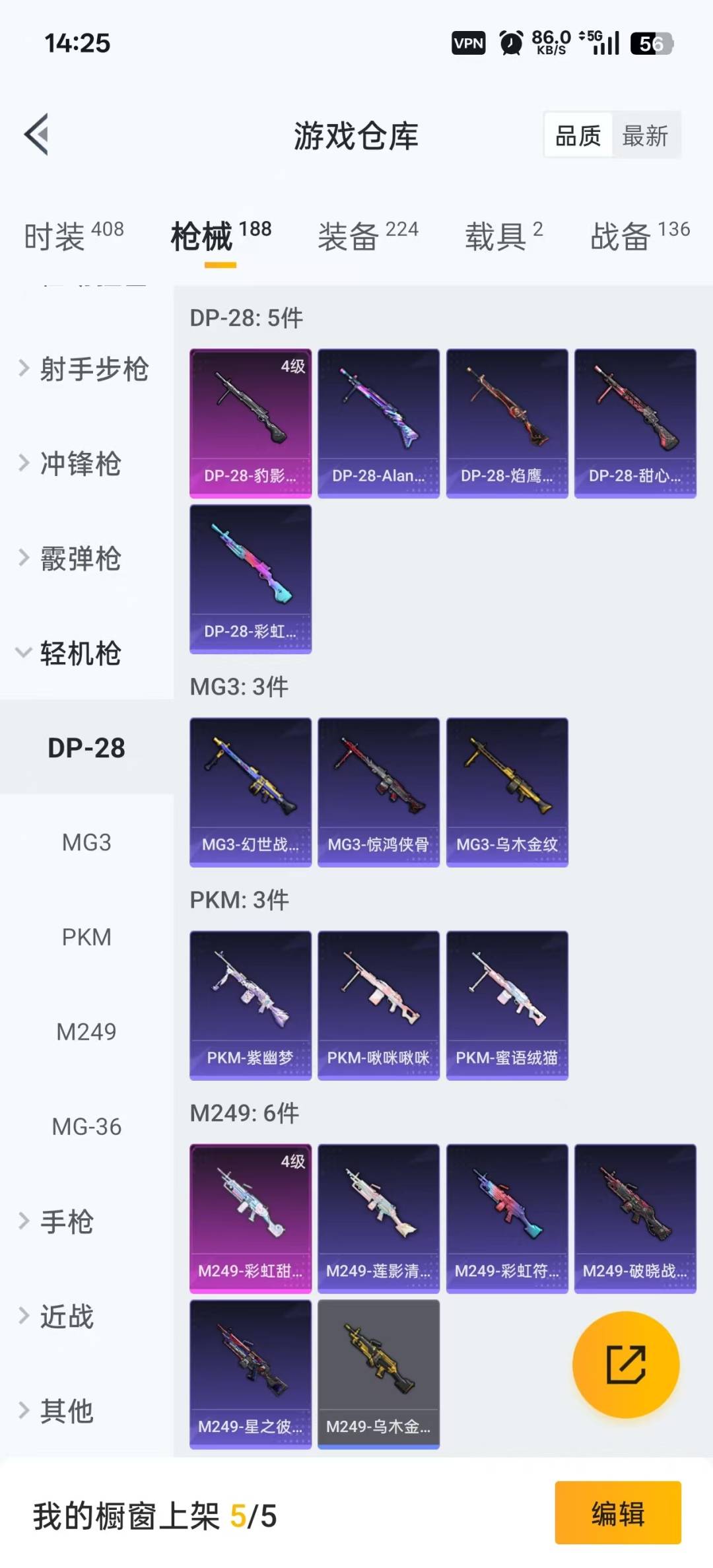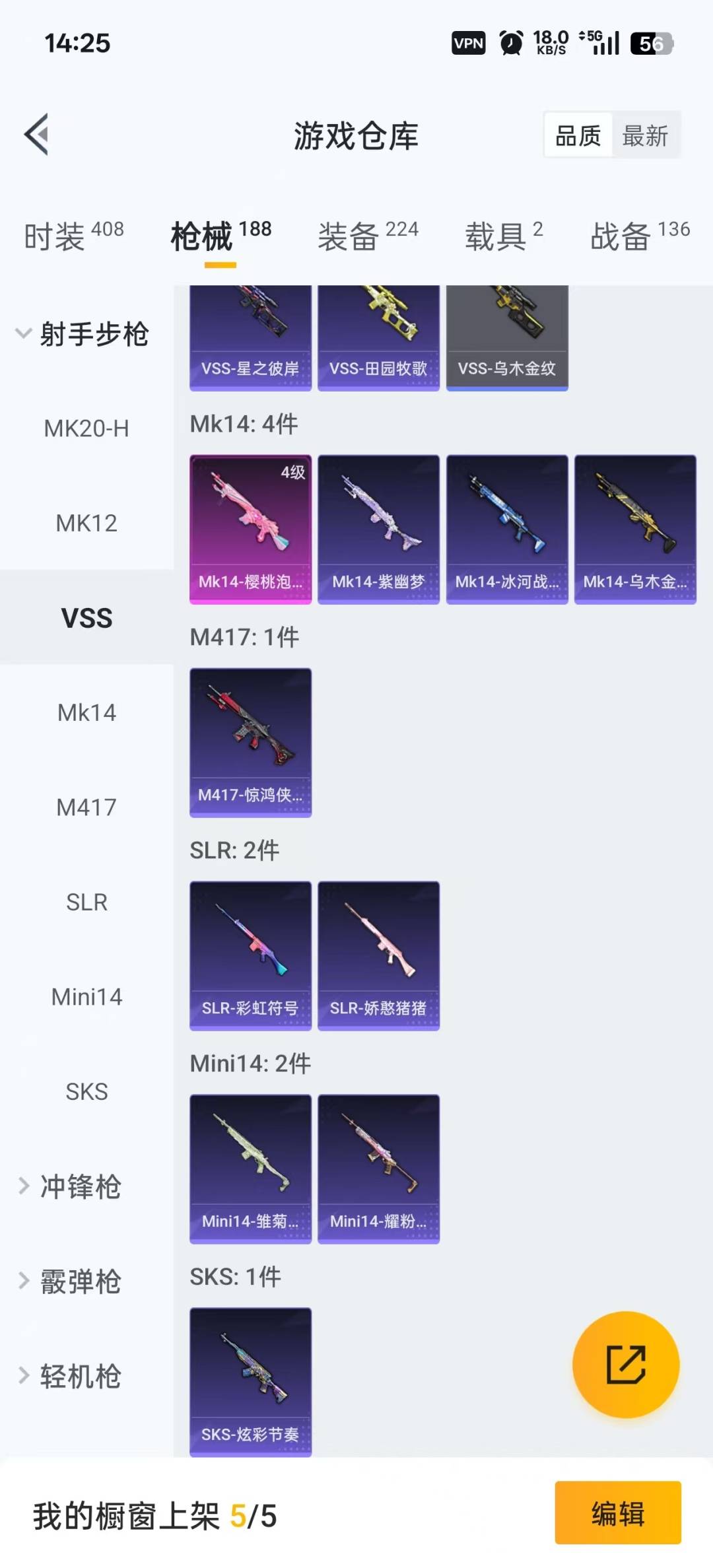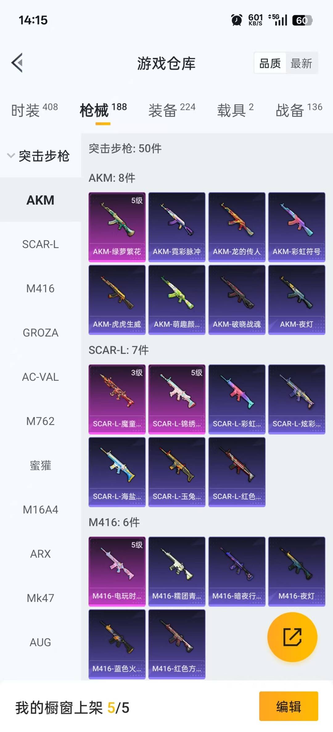 AKM-绿萝繁花,SCAR-L-锦绣绵绵,M416-电玩时刻,GROZA-镜光银凌,M762-青锋波束,Kar98K-巳巳如意,Mk14-樱桃泡泡,M249-彩虹甜喵