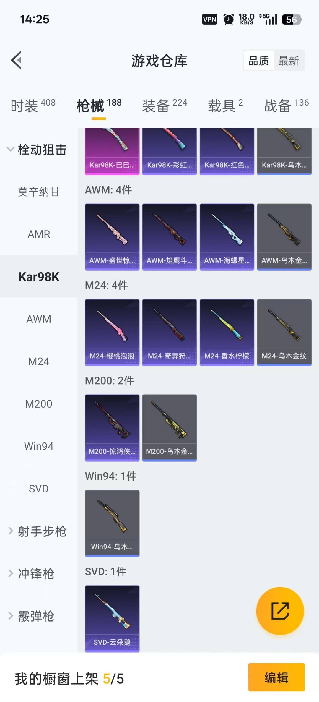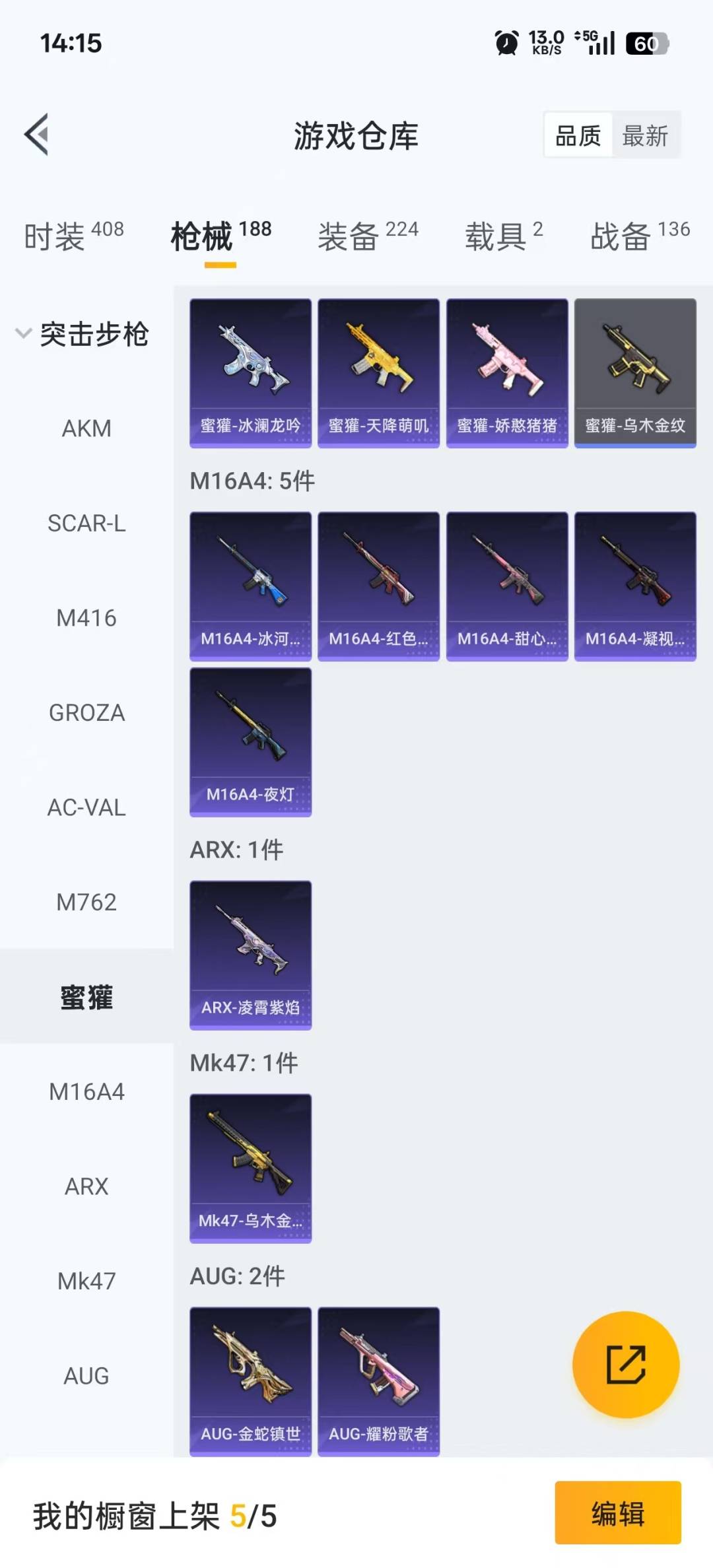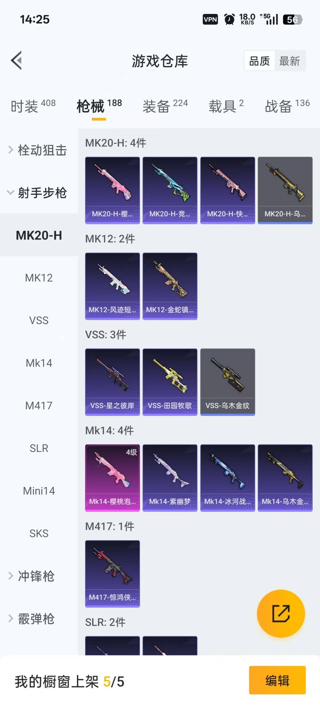 AKM-绿萝繁花,SCAR-L-锦绣绵绵,M416-电玩时刻,GROZA-镜光银凌,M762-青锋波束,Kar98K-巳巳如意,Mk14-樱桃泡泡,M249-彩虹甜喵