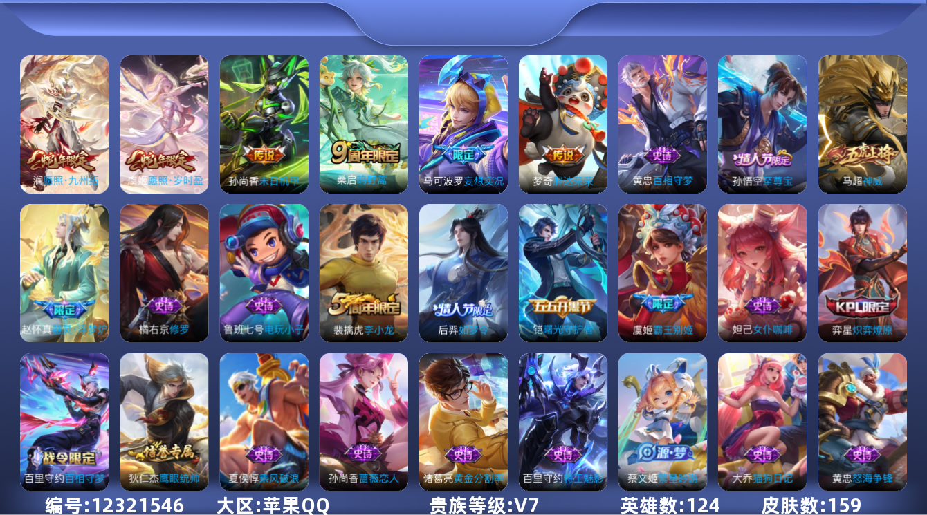 [12321546]V7 6传说 124英雄 159皮肤 可修改实名 优质装备:末日机甲-孙尚香(绿蚂蚱),胖达荣荣,妄想实况 珍宝阁皮:蔷薇恋人 限定皮:愿照·九州拓(澜年限),愿照·岁时盈(虞姬年限),逐霄战戟,鸣野蒿,至尊宝,神威(电光马子),天狼运算者,李小龙,如梦令-后羿,霸王别姬-虞姬 史诗皮:器灵·浮梦炉,茶境仙,怒海争锋,炽弈燎原,百相守梦-百里守约,百相守梦-黄忠,电玩小子(小书包),黄金分割率,特工魅影,偶像歌手,猫狗日记-孙策,猫狗日记-大乔,修罗,女仆咖啡,摇滚巨星,水果甜心,天才门将,功夫厨神,鬼剑武藏,心灵战警,舞动绿茵,繁星吟游(呼啦呼啦),缤纷独角兽,乘风破浪,逐浪之夏,曙光守护者,热力回旋,箭羽风息,圣诞狂欢,圣诞恋歌,鹰眼统帅