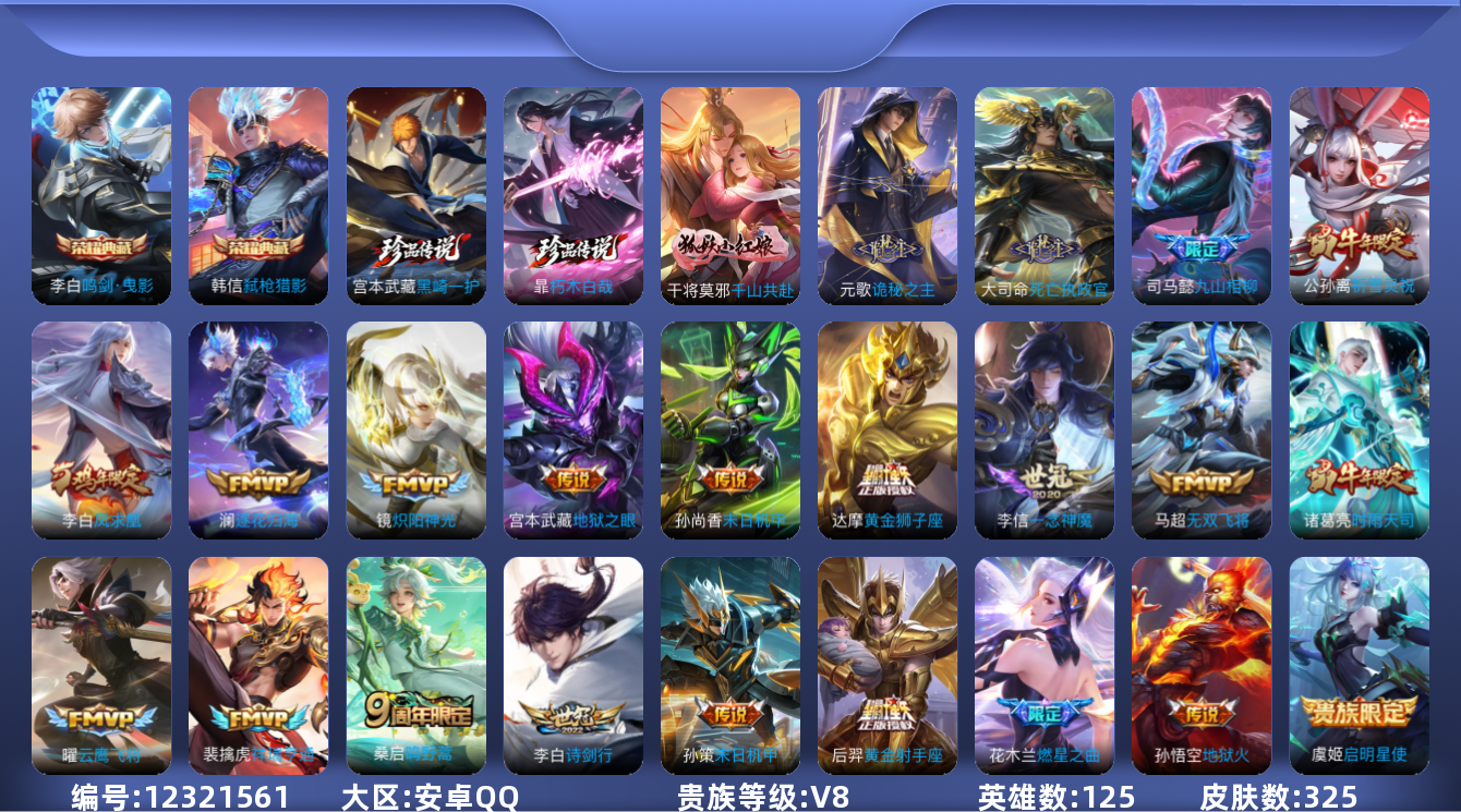 [12321561]V8 2典藏 2珍品传说 25传说 125英雄 325皮肤 可修改实名 优质装备:鸣剑·曳影,弑枪猎影(韩信典藏),朽木白哉,黑崎一护,黄金狮子座,黄金射手座,云鹰飞将(小将军),绛天战甲(鸡嘴战神),炽阳神光,一念神魔,末日机甲-孙尚香(绿蚂蚱),地狱火,地狱之眼,末日机甲-孙策,无双飞将,燃星之曲,电玩·雷克斯,澜逐花归海,诡秘之主,千山共赴,涂山容容 传说皮:死亡执政官,九山相柳,祥瑞亨通 珍宝阁皮:优雅恋人,蔷薇恋人 限定皮:鸣野蒿,至尊宝,凤求凰(白切鸡),时雨天司(水龙头),飞衡(韩信年限),遇见飞天,诗剑行,五谷丰年,冰锋战神,游园惊梦,梁祝,祈雪灵祝(雪兔子),李小龙,逐梦之影,霸王别姬-虞姬,默契交锋-花木兰,大圣娶亲,引擎之心,冰霜恋舞曲,美猴王 史诗皮:飞车小橘子,灵蛊蚀心,龙之律动,东方月初,百相守梦-黄忠,紫霞仙子,电玩小子(小书包),白龙吟,黄金分割率,特工魅影,千年之狐,江河有灵,鹤归松栖(赵怀真),蒙恬荣光圣徽,匿光破解者,冰冠公主,偶像歌手,电玩·兔顽号,电玩·爆裂旋风,暗夜猫娘,百相守梦(关羽),龙骑士(小龙虾),末日机甲-吕布,节奏热浪,女仆咖啡,摇滚巨星,水果甜心,天才门将,星夜王子,功夫厨神,德古拉伯爵,暗隐猎兽者,幽灵船长,鬼剑武藏,地狱岩魂,繁星吟游(呼啦呼啦),缤纷独角兽,乘风破浪,逐浪之夏,水晶猎龙者,箭羽风息,金属风暴,原初追逐者,圣诞狂欢,鹰眼统帅,王者之锤,暗夜贵公子,魅力维加斯,黎明之约,赏金猎手,未来纪元-赵云,玫瑰异探