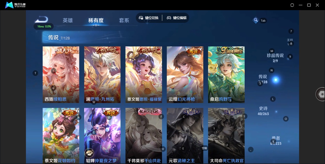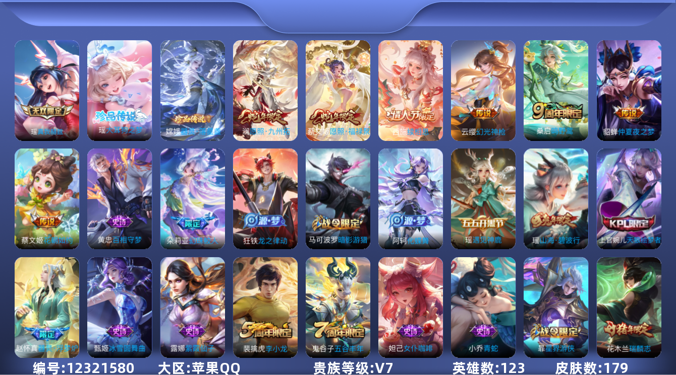 - [11688869]V7 1典藏 3传说 124英雄 274皮肤 可修改实名 优质装备:神鉴启示录,炽阳神光 珍宝阁皮:万物之道,蔷薇恋人 限定皮:愿照·岁时盈(虞姬年限),逐霄战戟,鸣野蒿,白晶晶,玄嵩(庄周年限),遇见飞天,五谷丰年,冰锋战神,梁祝,李小龙,霸王别姬-虞姬 史诗皮:器灵·浮梦炉,星界战将,芈月浮光幕影,蔬乡物语(鲁班七号),百相守梦-百里守约,紫霞仙子,黄金分割率,魅语,蒙恬荣光圣徽,冰冠公主,偶像歌手,白蛇,龙骑士(小龙虾),乱世虎臣,节奏热浪,女仆咖啡,水果甜心,绅士熊喵,星夜王子,心灵骇客,德古拉伯爵,暗隐猎兽者,鬼剑武藏,心灵战警,舞动绿茵,地狱岩魂,纤云弄巧,繁星吟游(呼啦呼啦),拒霜思,缤纷独角兽,乘风破浪,逐浪之夏,曙光守护者,箭羽风息,金属风暴,原初追逐者,圣诞狂欢,圣诞恋歌,鹰眼统帅,王者之锤,暗夜贵公子,魅力维加斯,黎明之约,未来纪元-赵云
