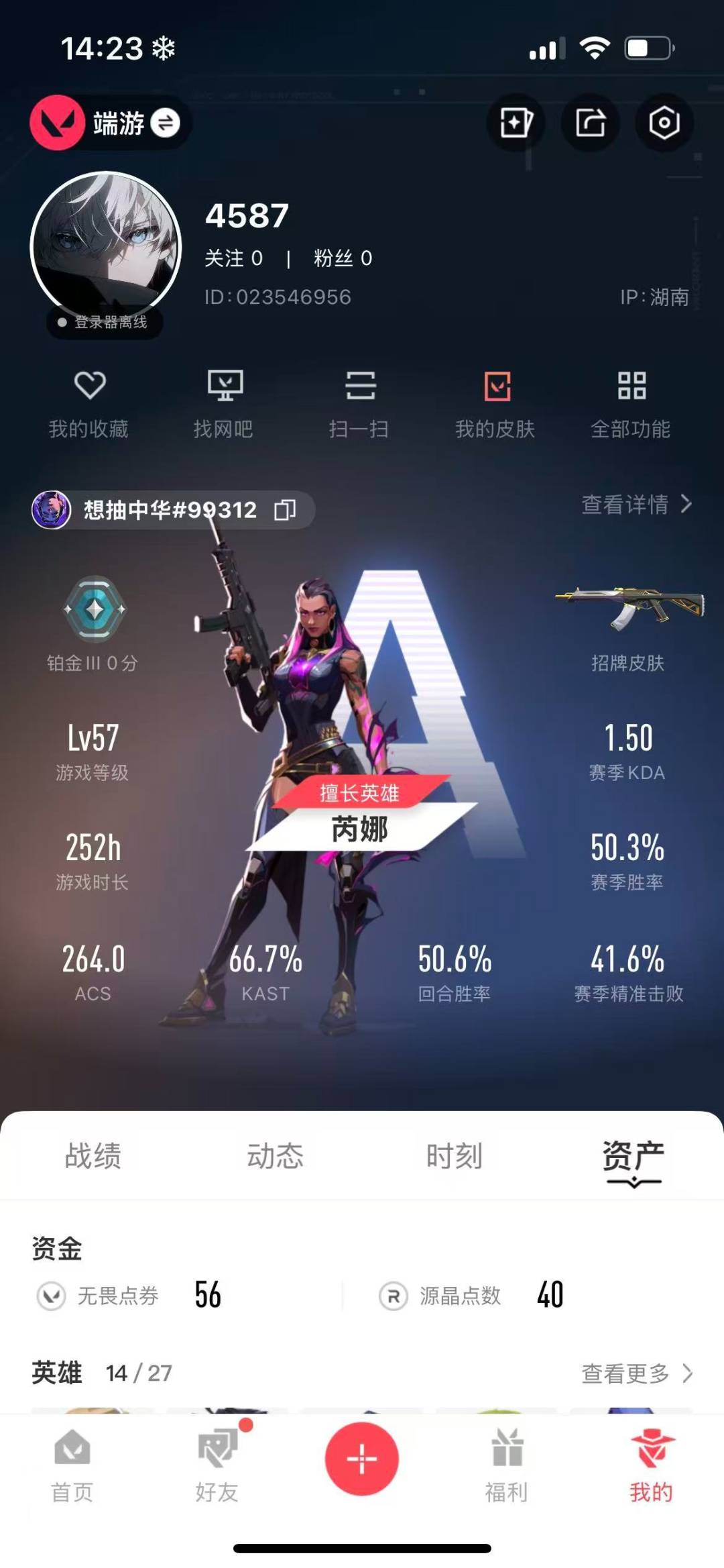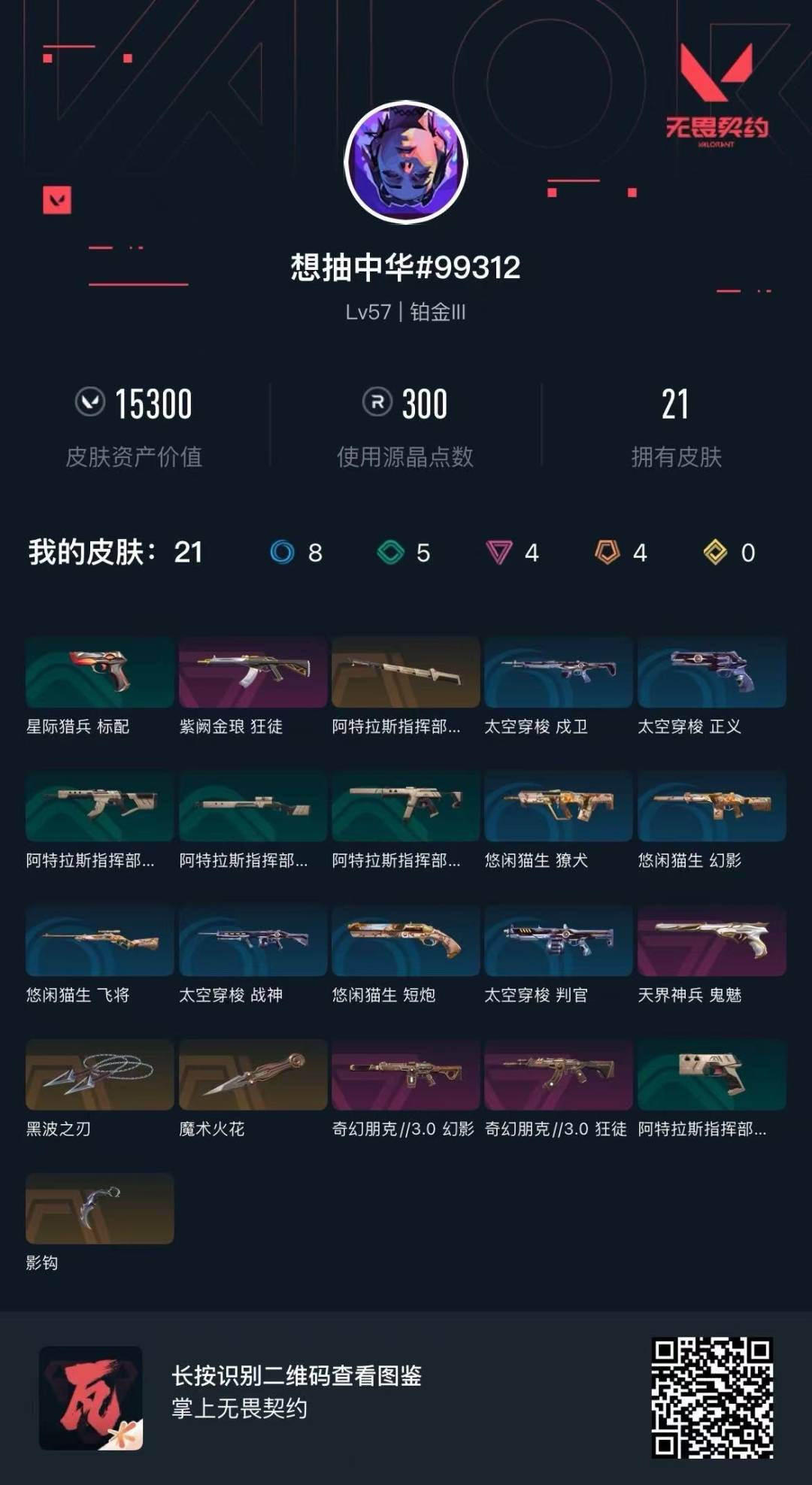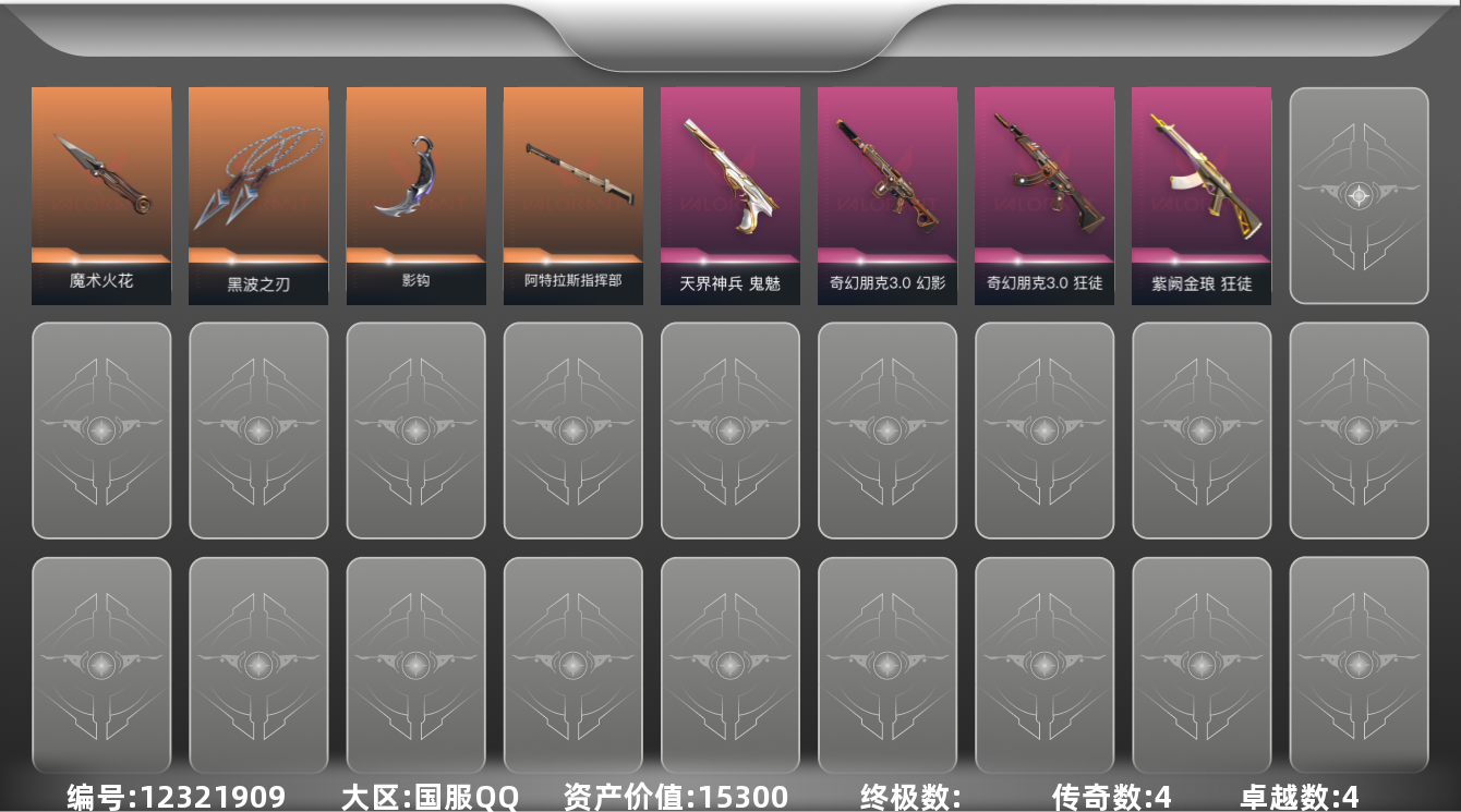 [12321909]4橙皮 4紫皮 21皮肤 14英雄 34卡面 300已用源晶 铂金 优质装备:狂徒-紫阙金琅,鬼魅-天界神兵,黑波之刃,阿特拉斯指挥部,影钩,魔术火花 步枪皮肤:奇幻朋克3.0狂徒,幻影-奇幻朋克3.0