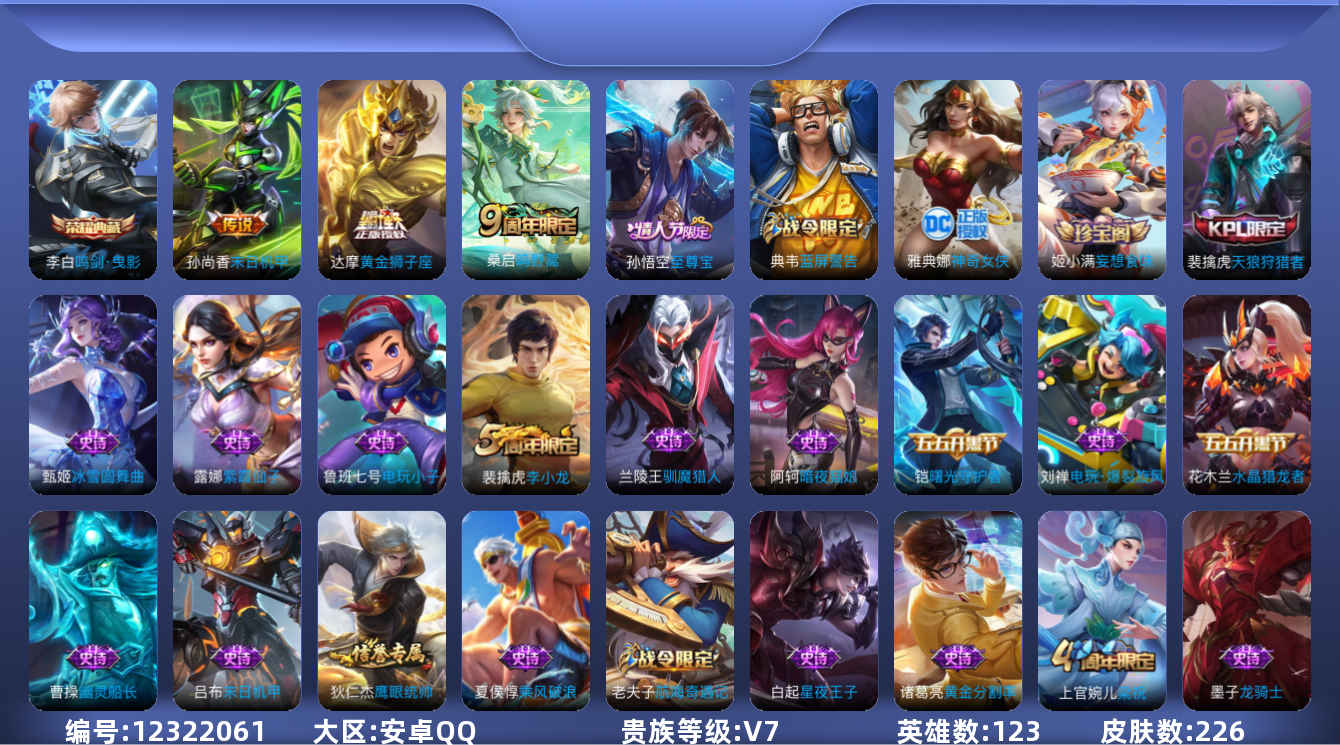 [12322061]V7 1典藏 3传说 123英雄 226皮肤 典藏英雄武则天 可修改实名 优质装备:鸣剑·曳影,黄金狮子座,末日机甲-孙尚香(绿蚂蚱) 珍宝阁皮:妄想食味,优雅恋人 限定皮:鸣野蒿,至尊宝,遇见飞天,梁祝,天狼狩猎者,李小龙,神奇女侠,寅虎·御盾(廉颇年限) 史诗皮:蒙犽顽岩魄,紫霞仙子,苍穹之光,电玩小子(小书包),白龙吟,黄金分割率,蒙恬荣光圣徽,冰冠公主,电玩·爆裂旋风,暗夜猫娘,龙骑士(小龙虾),末日机甲-吕布,猫狗日记-孙策,乱世虎臣,节奏热浪,摇滚巨星,水果甜心,绅士熊喵,星夜王子,功夫厨神,德古拉伯爵,幽灵船长,鬼剑武藏,天秀·启明,舞动绿茵,地狱岩魂,繁星吟游(呼啦呼啦),乘风破浪,逐浪之夏,水晶猎龙者,曙光守护者,金属风暴,原初追逐者,圣诞狂欢,圣诞恋歌,鹰眼统帅,暗夜贵公子,魅力维加斯,寅虎·御盾,未来纪元-赵云