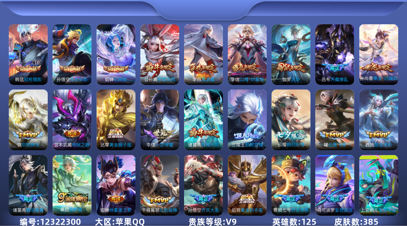 [12322300]V9 3典藏 33传说 125英雄 385皮肤 可修改实名 优质装备:全息碎影(猴子典藏),幻阙歌(貂蝉典藏),弑枪猎影(韩信典藏),黄金狮子座,黄金射手座,云鹰飞将(小将军),绛天战甲(鸡嘴战神),黄金白羊座,久胜战神,炽阳神光,一念神魔,地狱火,仲夏夜之梦(大飞蛾),零号·赤焰,地狱之眼,游龙清影(小青龙),淬星耀世,超时空战士-狄仁杰,山海·炽霜斩(李信年限),电玩·雷克斯,鹤羽星尊,灼幽烈阳,妄想实况,妄想奇谈,鹤归松栖(云缨),鲁班七号-时之奇旅 传说皮:乘龙·问璇玑(孙尚香年限) 珍宝阁皮:优雅恋人,蔷薇恋人,玩趣恶龙 限定皮:逐霄战戟,鸣野蒿,至尊宝,凤求凰(白切鸡),凤凰于飞,太华(伽罗年限),时之彼端,白晶晶,时雨天司(水龙头),神威(电光马子),飞衡(韩信年限),玄嵩(庄周年限),高山流水,齐天大圣,五谷丰年,幽恒(沐浴露),天狼运算者,梁祝,御风骁将(吕布年限),龙胆,烈魂,岱宗(典韦年限),天狼溯光者,虎魄,天狼征服者,奔雷神使(牛魔年限),祈雪灵祝(雪兔子),天狼绘梦者,李小龙,逐梦之影,朱雀志(守约年限),辉光之辰,如梦令-嫦娥,如梦令-后羿,霸王别姬-项羽,霸王别姬-虞姬,默契交锋-兰陵王,默契交锋-花木兰,猪悟能,大圣娶亲,引擎之心,天魔缭乱,冰霜恋舞曲,乒乒小将,山海·玄木吟(马可年限) 史诗皮:化蝶舞,超元猎域,乘龙·聚宝船(安琪拉年限),紫霞仙子,苍穹之光,白龙吟,特工魅影,千年之狐,江河有灵,匿光侦查者,末日机甲-莱西奥,鹤归松栖(赵怀真),真我赫兹(镜),真我赫兹(百里守约),浮梦罗烟,完美假期,魅语,百解令(蒙犽),高渐离燃音魔法,无限星赏官,匿光破解者,冰冠公主,青蛇,偶像歌手,晚萤,电玩·爆裂旋风,百相守梦(刘备),龙骑士(小龙虾),末日机甲-吕布,猫狗日记-孙策,时之恋人-孙尚香,乱世虎臣,节奏热浪,修罗,女仆咖啡,摇滚巨星,水果甜心,绅士熊喵,天才门将,星夜王子,心灵骇客,功夫厨神,德古拉伯爵,暗隐猎兽者,幽灵船长,鬼剑武藏,心灵战警,舞动绿茵,纤云弄巧,繁星吟游(呼啦呼啦),拒霜思,缤纷独角兽,乘风破浪,逐浪之夏,龙鼓争鸣,水晶猎龙者,曙光守护者,箭羽风息,金属风暴,原初追逐者,圣诞狂欢,圣诞恋歌,鹰眼统帅,魅力维加斯,黎明之约,天秀·音浪,无心,未来纪元-赵云