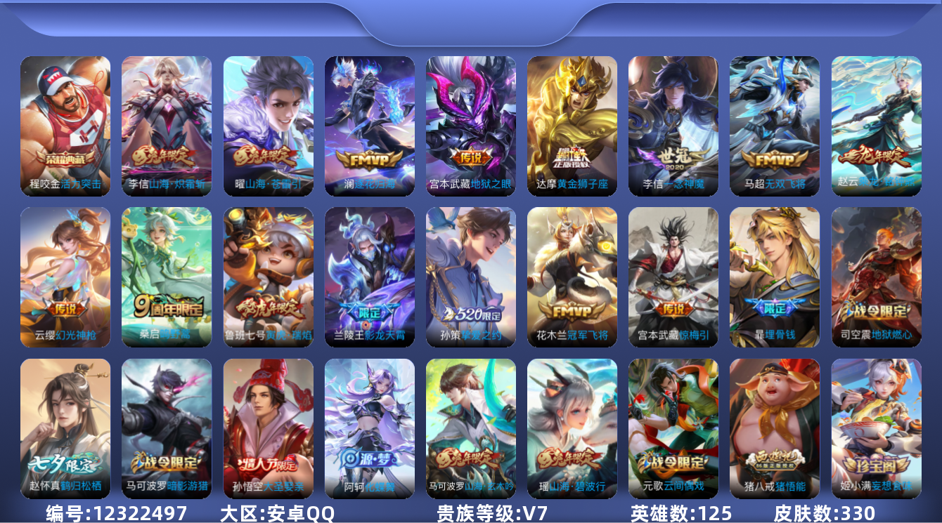 - [11519903]V8 2典藏 1无双 14传说 125英雄 227皮肤 可修改实名 孙悟空大国标 优质装备:全息碎影(猴子典藏),银白咏叹调(倪克斯侍卫),碎月剑心(李白无双),黄金射手座,猫影幻舞,炽阳神光,地狱火,胖达荣荣,乞巧织情,淬星耀世,无双飞将 珍宝阁皮:优雅恋人 限定皮:至尊宝,白虎志(电光耗子),神威(电光马子),齐天大圣,怒海麟威,五谷丰年,梁祝,天狼征服者,天狼绘梦者,李小龙,辉光之辰,猪悟能,大圣娶亲,寅虎·赤拳(老虎年限),枫霜尽 史诗皮:星界战将,东方月初,紫霞仙子,电玩小子(小书包),白龙吟,黄金分割率,特工魅影,千年之狐,蒙恬荣光圣徽,偶像歌手,龙骑士(小龙虾),暗夜猫娘,魅语,冰冠公主,末日机甲-吕布,猫狗日记-孙策,节奏热浪,摇滚巨星,水果甜心,绅士熊喵,星夜王子,功夫厨神,暗隐猎兽者,幽灵船长,鬼剑武藏,心灵战警,舞动绿茵,纤云弄巧,繁星吟游(呼啦呼啦),乘风破浪,曙光守护者,金属风暴,原初追逐者,圣诞狂欢,圣诞恋歌,鹰眼统帅,赏金猎手,未来纪元-赵云