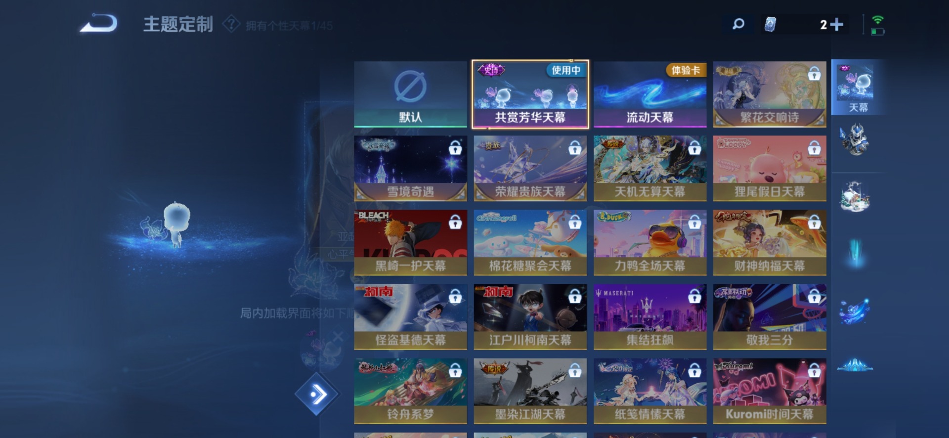 大乔猫狗日记,高渐离燃音魔法,刘邦德古拉伯爵,夏侯惇乘风破浪,阿轲暗夜猫娘,阿轲节奏热浪,哪吒雪上飞焰,铠曙光守护者,曹操幽灵船长,伽罗箭羽风息,廉颇地狱岩魂,小乔缤纷独角兽,小乔青蛇,孙策猫狗日记,赵怀真鹤归松栖,赵怀真器灵·浮梦炉,项羽苍穹之光,吕布圣诞狂欢,露娜紫霞仙子,吕布末日机甲,诸葛亮黄金分割率,刘禅电玩·爆裂旋风,刘禅天才门将,刘禅绅士熊喵,宫本武藏鬼剑武藏,杨玉环银翎春语,兰陵王暗隐猎兽者,貂蝉圣诞恋歌,花木兰水晶猎龙者,李白千年之狐,安琪拉心灵骇客,蒙犽百解令,杨戬天秀·启明,白起星夜王子,亚瑟心灵战警,嬴政摇滚巨星,程咬金功夫厨神,百里玄策原初追逐者,雅典娜冰冠公主,雅典娜黎明之约,百里守约特工魅影,李元芳逐浪之夏,墨子龙骑士,墨子金属风暴,蔡文姬舞动绿茵,澜赏金猎手,娜可露露晚萤,嫦娥拒霜思,橘右京修罗
