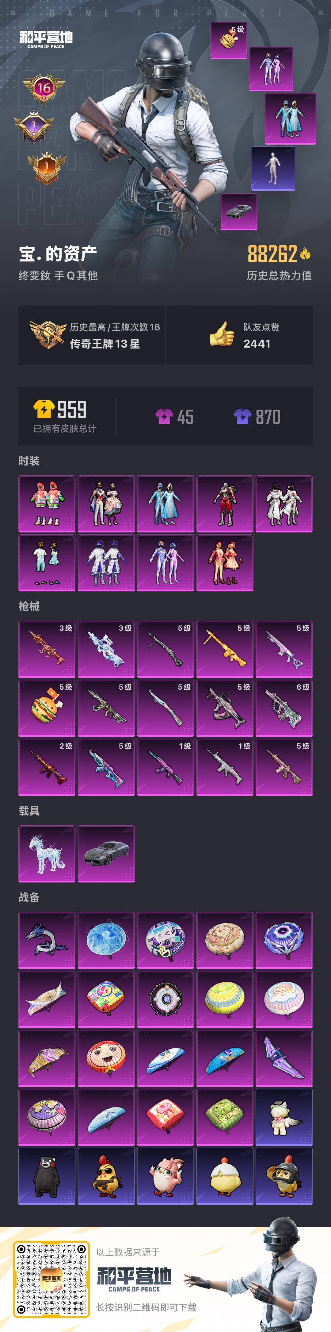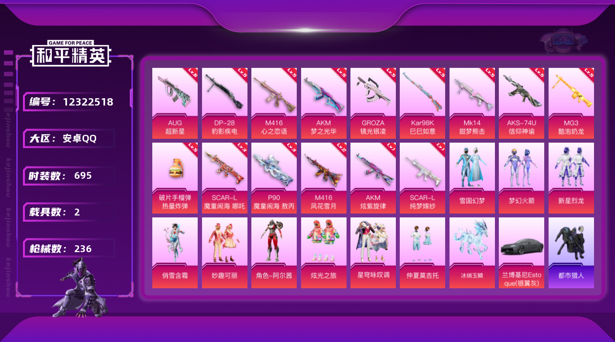 [12322518]9粉装 15特效枪 2载具 16印记 可二次 可修改实名 身法装备:都市猎人,暗影哥特(红眼罩),冥河战士(老木乃伊),ACT追光队服,萌熊伴侣背包(粉熊背包) 优质装备:冥河战士(老木乃伊),木乃伊套装(老)(冥河战士),雪国幻梦(冰雪女王),兰博基尼Estoque(银翼灰),都市猎人,萌熊伴侣背包(粉熊背包),AKM炫紫旋律,M416心之恋语,奇异狩猎者,梦幻火箭(新101)(新火箭少女101粉色套装),新星烈龙(小白龙),AKM梦之光华,M416风花雪月,SCAR-L纯梦嫁纱,AUG超新星,MG3酷泡奶龙,GROZA-镜光银凌,AKS-74U-信仰神谕,破片手榴弹-热量炸弹,星穹咏叹调,MK14-甜梦熊击,Kar98K-巳巳如意 热门装扮:俏雪含霜,妙趣可丽,仲夏莫吉托,阿尔茜,炫光之旅,兔兔白日梦,动感兔斯基,胖达团团,激萌罗小黑,大橘为重,鹰眼刺客,深海小丑鱼,都市猎人,银碳小老虎 载具:冰绡玉鳞 稀有枪皮:P90-魔童闹海 敖丙,SCAR-L-魔童闹海 哪吒,DP-28-豹影疾电 六级特效枪:六级AUG-超新星 五级特效枪:五级GROZA-镜光银凌,五级AKS-74U-信仰神谕,五级M416-心之恋语,五级Kar98K-巳巳如意,五级DP-28-豹影疾电,五级MK14-甜梦熊击,五级破片手榴弹-热量炸弹,五级MG3-酷泡奶龙,五级AKM-梦之光华 三级特效枪:三级P90-魔童闹海 敖丙,三级SCAR-L-魔童闹海 哪吒 二级特效枪:二级M416-风花雪月 一级特效枪:一级AKM-炫紫旋律,一级SCAR-L-纯梦嫁纱 紫色装扮:幻彩翩翩,SS23特训,妙红点点,SS30特训套装,SS31特训套装,云朵鹅,彩虹兔,雪绒豹,SS33特训套装,旭日情侣,灵蜜圈圈,飞狐塔尔斯,SS21特训,绚烂繁星,田园牧歌,轻风白浪,和煦暖阳,SS22特训,香榭午后,龙舌兰冰茶,顶瓜瓜,北国孤狼,坚韧舞者,夏日倾情,夏日音浪,幻世战舞者,萌趣咩咩,六六大吉,军械专家,娇憨猪猪,SS16特训,瑞龙福将,团圆交子,醒狮腾龙,SS17特训,迪迦奥特曼,SS20特训,香草威化,甜心亚梦,虚音幻奏,怒火燎原,异彩先驱,SS18特训,雪兔飞飞,飞驰魅影,音速流光,极速竞梦,SS19特训,飞行日记,魅力单车,鹤鸣,麻辣教官,黄色伏地魔,黎明保卫者,黑色伏地魔,龙的传人,龙腾端午,龟仙人,蝶变