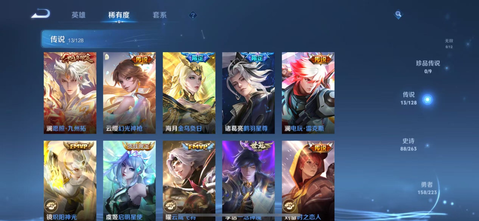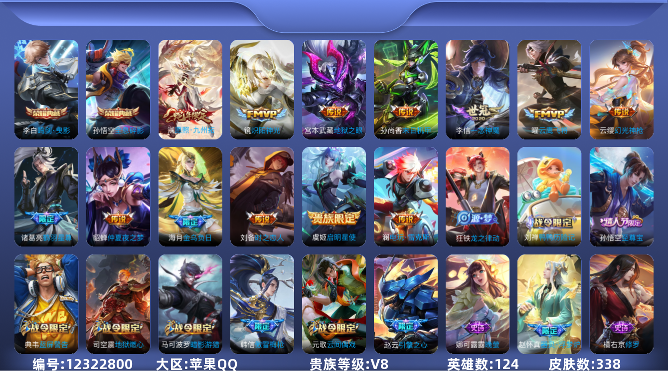 [12322800]V8 2典藏 13传说 124英雄 338皮肤 可修改实名 优质装备:鸣剑·曳影,全息碎影(猴子典藏),云鹰飞将(小将军),炽阳神光,一念神魔,末日机甲-孙尚香(绿蚂蚱),仲夏夜之梦(大飞蛾),地狱之眼,时之恋人-刘备(电焊工),电玩·雷克斯,鹤羽星尊,金乌负日 传说皮:幻光神枪 珍宝阁皮:胡桃夹子,优雅恋人 限定皮:愿照·九州拓(澜年限),至尊宝,傲雪梅枪,五谷丰年,梁祝,李小龙,引擎之心 史诗皮:器灵·浮梦炉,鸭鸭历险记-刘禅,龙之律动,茶境仙,星界特工,破空之剑,芈月浮光幕影,怒海争锋,蔬乡物语(鲁班七号),紫霞仙子,电玩小子(小书包),黄金分割率,特工魅影,千年之狐,永昼,江河有灵,龙骑士(小龙虾),高渐离燃音魔法,蒙恬荣光圣徽,晚萤,无限星赏官,冰冠公主,电玩·爆裂旋风,末日机甲-吕布,猫狗日记-孙策,时之恋人-孙尚香,乱世虎臣,节奏热浪,修罗,女仆咖啡,摇滚巨星,水果甜心,绅士熊喵,天才门将,星夜王子,心灵骇客,功夫厨神,德古拉伯爵,暗隐猎兽者,幽灵船长,鬼剑武藏,心灵战警,地狱岩魂,纤云弄巧,拒霜思,缤纷独角兽,乘风破浪,逐浪之夏,龙鼓争鸣,水晶猎龙者,曙光守护者,箭羽风息,金属风暴,原初追逐者,圣诞狂欢,圣诞恋歌,鹰眼统帅,暗夜贵公子,魅力维加斯,无心,未来纪元-赵云