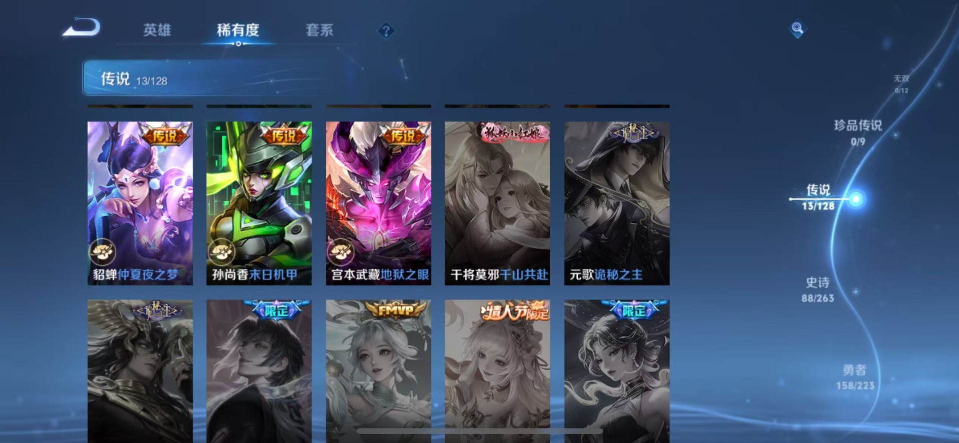 刘邦夺宝奇兵,夏侯惇朔风刀,老夫子醍醐杖,沈梦溪星空之诺,沈梦溪大漠名商,盾山御銮,苏烈千军破阵,典韦穷奇,典韦蓝屏警告,达摩沙漠行僧,牛魔御旌,项羽苍威无极,鲁班七号狮舞东方,吕布猎兽之王,镜青焰无极,元歌云间偶戏,兰陵王金庭之子,裴擒虎擒涛扼浪,鲁班大师探海日志,明世隐疑决卦,蒙犽狂想玩偶喵,马可波罗暗影游猎,白起狰,鬼谷子原初探秘者,张良古海寻踪,女娲朔望之晖,桑启海盐诗旅,狄仁杰万华元夜,程咬金演武夺筹,李元芳银河之约,李元芳云中旅人,弈星混沌棋,米莱狄御霄,钟馗神迹守卫,钟馗驱傩正仪,狂铁御狮