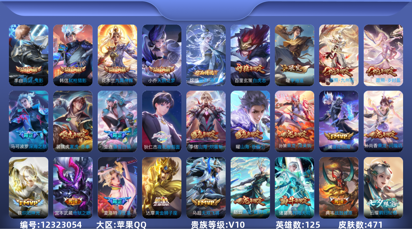 [12323054]V10 4典藏 1珍品传说 60传说 125英雄 471皮肤 可修改实名 优质装备:天鹅之梦(小乔典藏),鸣剑·曳影,九霄神辉(木兰典藏),弑枪猎影(韩信典藏),器灵·落星盏,黄金狮子座,黄金射手座,云鹰飞将(小将军),猫影幻舞,炽阳神光,云霓雀翎,仲夏夜之梦(大飞蛾),零号·赤焰,地狱之眼,飞鸢探春,李逍遥,淬星耀世,超时空战士-狄仁杰,遇见胡旋,无双飞将,音你闪耀(rap皮),碎云,神器·狴犴令,山海·炽霜斩(李信年限),山海·琳琅生(小乔年限),山海·苍雷引(电光曜子),炽翼辉光(娃娃菜牛角包),燃星之曲,画中仙,浮生妄,鹤归松栖(云缨),惊梅引,遇见神鼓,大乔-时之奇旅,永恒水手月亮,夜礼服假面,澜逐花归海,艾琳觅芳踪,金乌负日 传说皮:乘龙·问璇玑(孙尚香年限),乘龙·铭钟鼎(赵云年限),乘龙·淬吴钩(孙策年限),貂蝉曦玄引,吕布曦玄引,典韦战鼓燎原,落雪白狼,幻光神枪 珍宝阁皮:妄想食味,蔷薇恋人,女武神 限定皮:愿照·九州拓(澜年限),愿照·岁时盈(虞姬年限),白虎志(电光耗子),武陵仙君(小桃花),异界灵契(白毛香),傲雪梅枪,前尘镜,绯月行,时雨天司(水龙头),神威(电光马子),山海·碧波行(瑶年限),无限倾心-项羽,瑞麟志(木兰年限),至美·乘鲤谣,至美·化雀舞,影龙天霄,高山流水,诗剑行,无限倾心-虞姬,匿光决锋者,怒海麟威,五谷丰年,青龙志(铠年限),冰锋战神,游园惊梦,梁祝,御风骁将(吕布年限),天狼狩猎者,龙胆,逐梦之星,烈魂,岱宗(典韦年限),天狼溯光者,虎魄,逐梦之音,李小龙,玄武志(苏烈年限),朱雀志(守约年限),如梦令-嫦娥,如梦令-后羿,霸王别姬-虞姬,纯白花嫁,孙行者,大圣娶亲,青春决赛季,乒乒小将,寅虎·御盾(廉颇年限),寅虎·心曲(虎婆),寅虎·赤拳(老虎年限),百木心枪,深海之息(深海大菠萝),枫霜尽,神器·万象笔,山海·玄木吟(马可年限) 史诗皮:器灵·浮梦炉,狼魂孤将,灵蛊蚀心,星界战将,石田雨龙,怒海争锋,埋骨钱,琥珀纪元伽罗,奇遇星旅,蔬乡物语(鲁班七号),曹操夜都魔契,超元猎域,乘龙·聚宝船(安琪拉年限),乘龙·忆丹青(大乔年限),百相守梦-百里守约,百相守梦-黄忠,织梦人,紫霞仙子,电玩小子(小书包),白龙吟,黄金分割率,特工魅影,千年之狐,永昼,江河有灵,匿光侦查者,鹤归松栖(赵怀真),真我赫兹(镜),