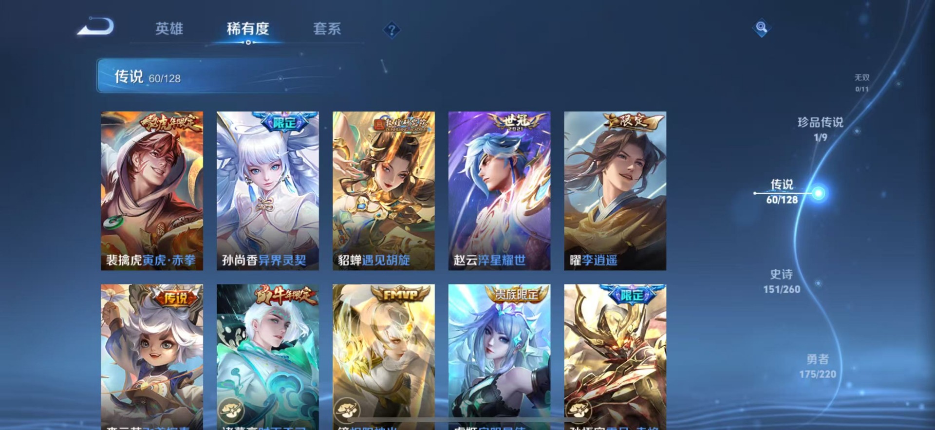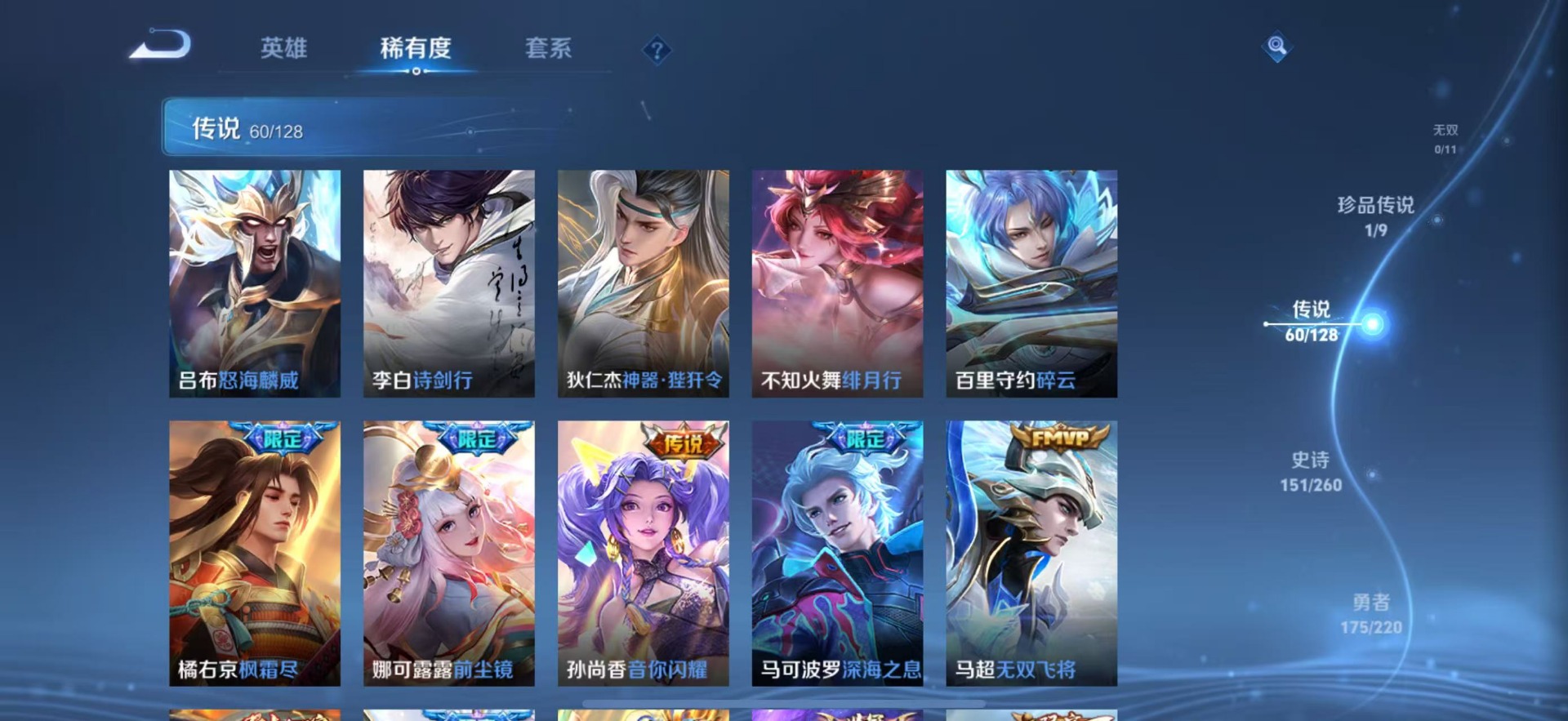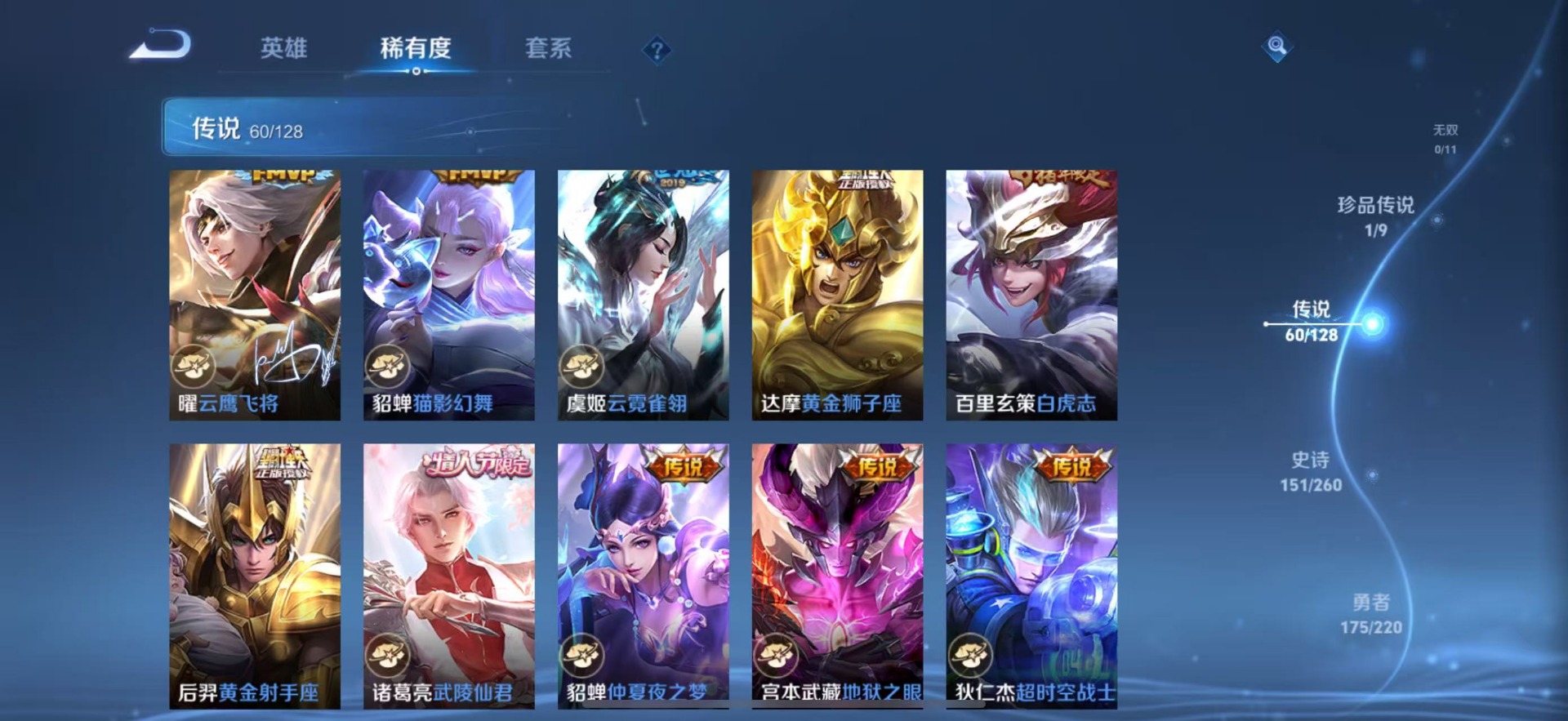 夏侯惇匿光决锋者,黄忠烈魂,甄姬至美·化雀舞,铠青龙志,廉颇寅虎·御盾,伽罗天狼溯光者,苏烈玄武志,张飞虎魄,赵云百木心枪,赵云龙胆,小乔纯白花嫁,典韦岱宗,孙尚香异界灵契,不知火舞绯月行,鲁班七号乒乒小将,吕布御风骁将,后羿如梦令,诸葛亮时雨天司,杨玉环寅虎·心曲,兰陵王影龙天霄,貂蝉逐梦之音,裴擒虎李小龙,裴擒虎天狼狩猎者,裴擒虎寅虎·赤拳,上官婉儿梁祝,上官婉儿神器·万象笔,李白诗剑行,花木兰瑞麟志,花木兰青春决赛季,马可波罗逐梦之星,马可波罗山海·玄木吟,马可波罗深海之息,西施至美·乘鲤谣,孙悟空孙行者,孙悟空大圣娶亲,百里玄策白虎志,马超神威,韩信傲雪梅枪,百里守约朱雀志,瑶山海·碧波行,澜愿照·九州拓,虞姬霸王别姬,虞姬愿照·岁时盈,娜可露露前尘镜,嫦娥如梦令,关羽冰锋战神,橘右京枫霜尽