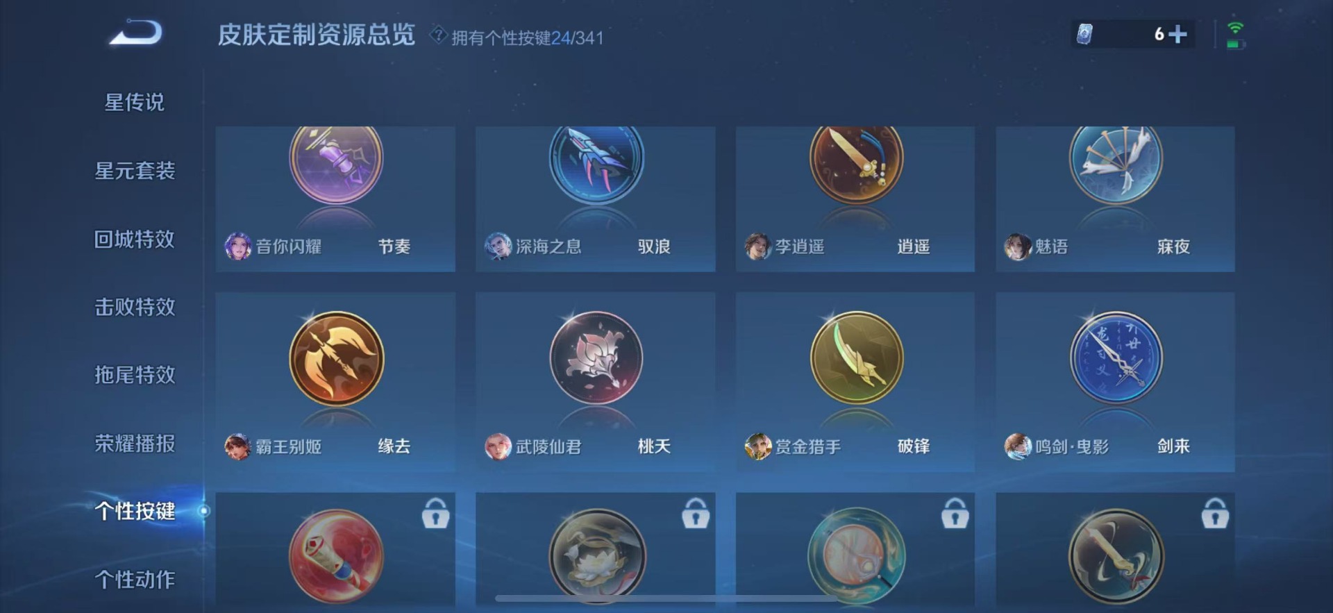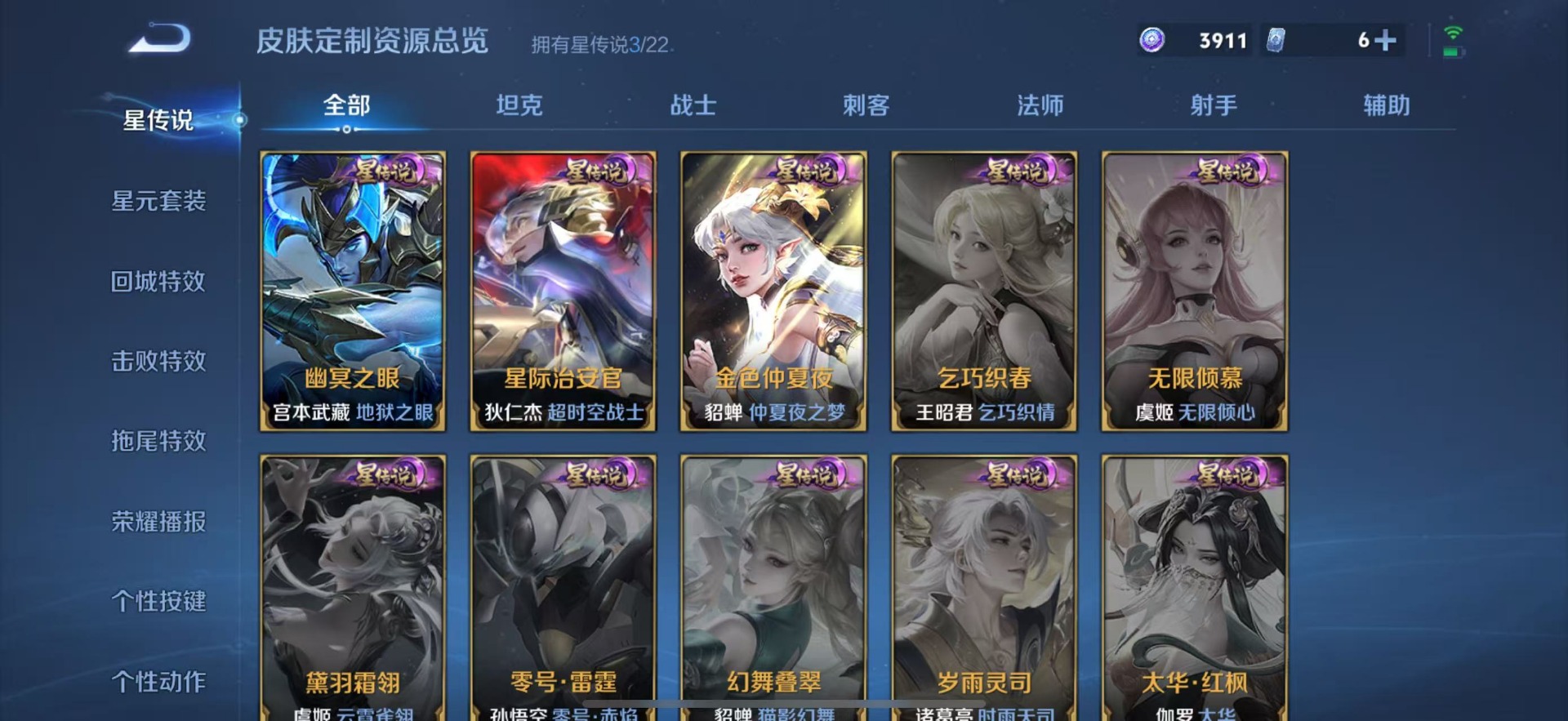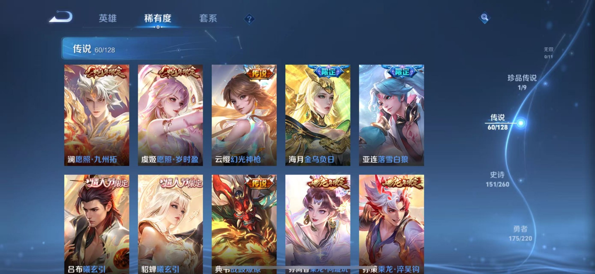 夏侯惇匿光决锋者,黄忠烈魂,甄姬至美·化雀舞,铠青龙志,廉颇寅虎·御盾,伽罗天狼溯光者,苏烈玄武志,张飞虎魄,赵云百木心枪,赵云龙胆,小乔纯白花嫁,典韦岱宗,孙尚香异界灵契,不知火舞绯月行,鲁班七号乒乒小将,吕布御风骁将,后羿如梦令,诸葛亮时雨天司,杨玉环寅虎·心曲,兰陵王影龙天霄,貂蝉逐梦之音,裴擒虎李小龙,裴擒虎天狼狩猎者,裴擒虎寅虎·赤拳,上官婉儿梁祝,上官婉儿神器·万象笔,李白诗剑行,花木兰瑞麟志,花木兰青春决赛季,马可波罗逐梦之星,马可波罗山海·玄木吟,马可波罗深海之息,西施至美·乘鲤谣,孙悟空孙行者,孙悟空大圣娶亲,百里玄策白虎志,马超神威,韩信傲雪梅枪,百里守约朱雀志,瑶山海·碧波行,澜愿照·九州拓,虞姬霸王别姬,虞姬愿照·岁时盈,娜可露露前尘镜,嫦娥如梦令,关羽冰锋战神,橘右京枫霜尽
