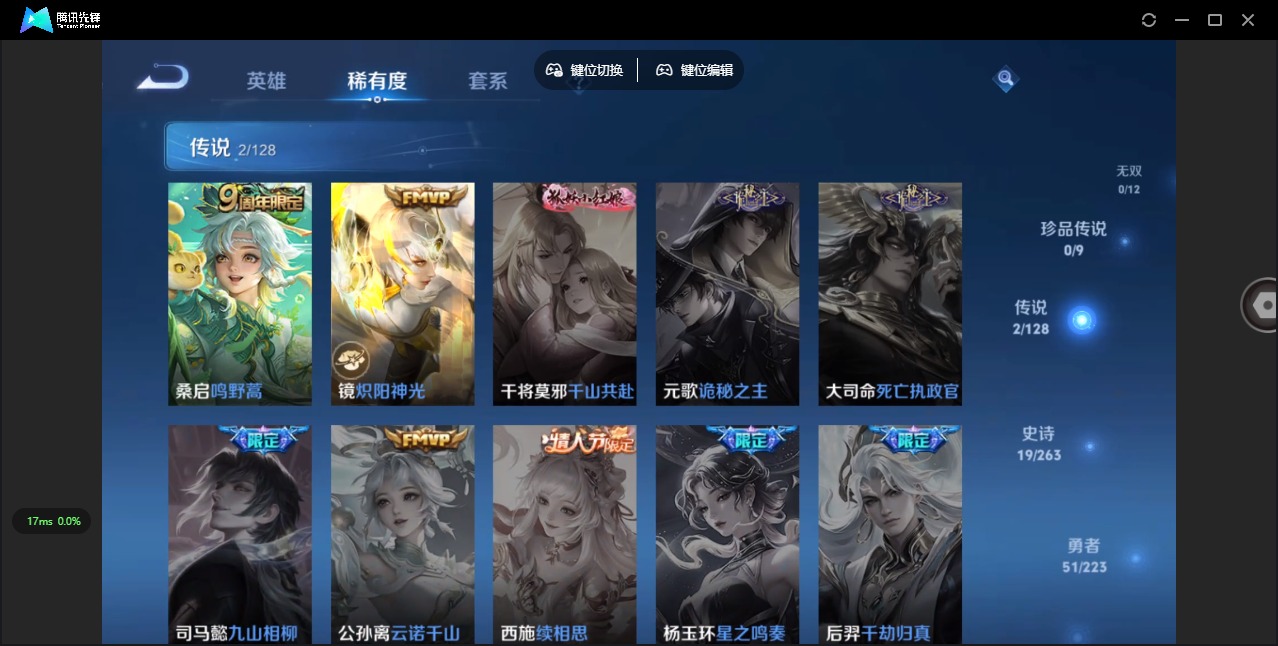 - PX_2070711-51 安卓QQ/至尊星耀/251皮肤/125英雄/0典藏/0珍品无双/0无双/2珍品传说/15传说/67史诗/9稀有英雄 【2 珍品传说】怪盗基德 马可波罗,江户川柯南 鲁班七号, 【15 传说皮肤】枫霜尽 橘右京,无限倾心 虞姬,无双飞将 马超,齐天大圣 孙悟空,地狱之眼 宫本武藏,炽阳神光 镜,无限倾心 项羽,时之恋人 刘备,一念神魔 李信,画中仙 干将莫邪,山海·苍雷引