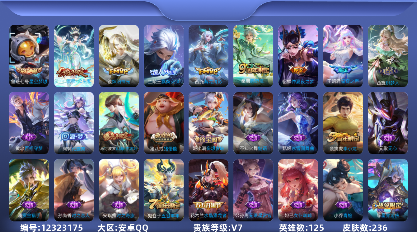 - [11820032]V7 5传说 125英雄 227皮肤 可修改实名 优质装备:久胜战神,鹤羽星尊,惊梅引 传说皮:铠冥王哈迪斯 珍宝阁皮:万物之道,优雅恋人,女武神 限定皮:逐霄战戟,鸣野蒿,至尊宝,遇见飞天,高山流水,五谷丰年,李小龙,朱雀志(守约年限),大圣娶亲 史诗皮:星界战将,谪仙醉月,雪豹·霜爪,藏狐·褐绒,石田雨龙,百相守梦-百里守约,星界特工,百相守梦-黄忠,紫霞仙子,苍穹之光,特工魅影,江河有灵,高渐离燃音魔法,蒙恬荣光圣徽,冰冠公主,偶像歌手,电玩·爆裂旋风,暗夜猫娘,末日机甲-吕布,猫狗日记-孙策,时之恋人-孙尚香,乱世虎臣,节奏热浪,女仆咖啡,摇滚巨星,水果甜心,绅士熊喵,天才门将,星夜王子,功夫厨神,暗隐猎兽者,幽灵船长,鬼剑武藏,心灵战警,乐园奇幻夜,天秀·启明,舞动绿茵,地狱岩魂,纤云弄巧,繁星吟游(呼啦呼啦),缤纷独角兽,乘风破浪,水晶猎龙者,曙光守护者,金属风暴,原初追逐者,圣诞恋歌,鹰眼统帅,魅力维加斯,黎明之约