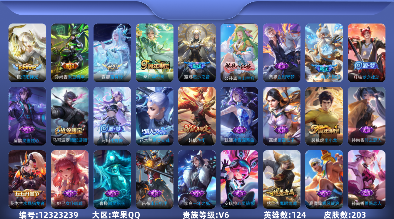 [12323239]V6 5传说 124英雄 203皮肤 可修改实名 优质装备:炽阳神光,末日机甲-孙尚香(绿蚂蚱),霜月吟,涂山容容 珍宝阁皮:蔷薇恋人,女武神 限定皮:逐霄战戟,鸣野蒿,飞衡(韩信年限),高山流水,梁祝,李小龙,默契交锋-花木兰,启示之音 史诗皮:化蝶舞,灵蛊蚀心,星界战将,龙之律动,藏狐·褐绒,百相守梦-黄忠,紫霞仙子,苍穹之光,特工魅影,千年之狐,江河有灵,百解令(蒙犽),蒙恬荣光圣徽,偶像歌手,末日机甲-吕布,猫狗日记-大乔,时之恋人-孙尚香,节奏热浪,女仆咖啡,水果甜心,心灵骇客,功夫厨神,暗隐猎兽者,幽灵船长,鬼剑武藏,心灵战警,舞动绿茵,地狱岩魂,缤纷独角兽,乘风破浪,逐浪之夏,水晶猎龙者,金属风暴,原初追逐者,圣诞恋歌,鹰眼统帅,魅力维加斯,黎明之约,未来纪元-赵云