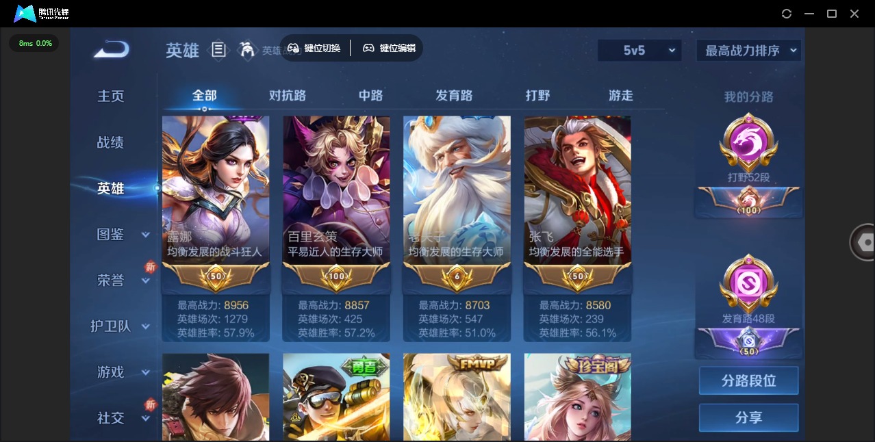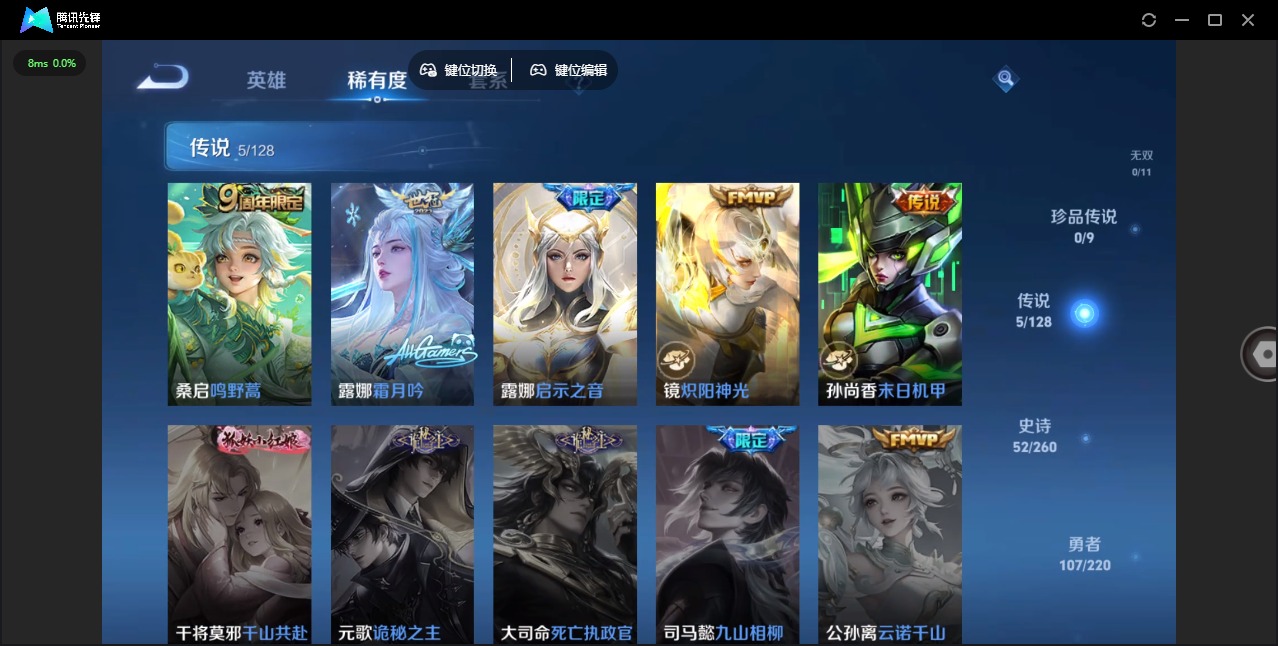 - PX_2095053-实名: 可修改 贵族等级: V5 英雄数: 124 皮肤数: 138 星传说: 星际治安官 传说皮: 黄金白羊座,超时空战士-狄仁杰,澜逐花归海,典韦战鼓燎原,云诺千山 限定皮: 鸣野蒿,陌上桑,愿照·九州拓