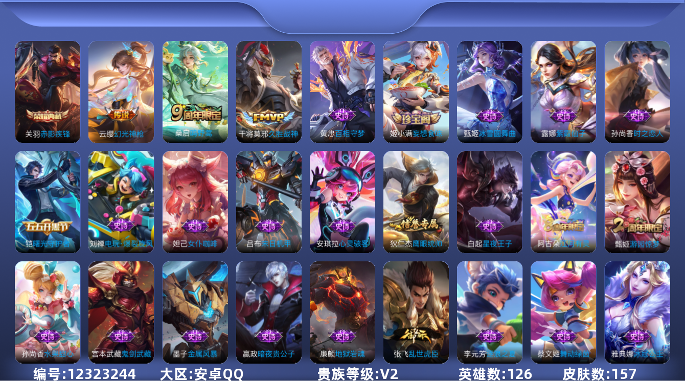 [12323244]V2 1典藏 3传说 126英雄 157皮肤 可修改实名 优质装备:赤影疾锋,久胜战神 传说皮:幻光神枪 珍宝阁皮:妄想食味 限定皮:鸣野蒿,游园惊梦 史诗皮:蒙犽顽岩魄,百相守梦-黄忠,紫霞仙子,江河有灵,冰冠公主,电玩·爆裂旋风,末日机甲-吕布,时之恋人-孙尚香,乱世虎臣,女仆咖啡,摇滚巨星,水果甜心,星夜王子,心灵骇客,鬼剑武藏,舞动绿茵,地狱岩魂,逐浪之夏,曙光守护者,金属风暴,鹰眼统帅,暗夜贵公子