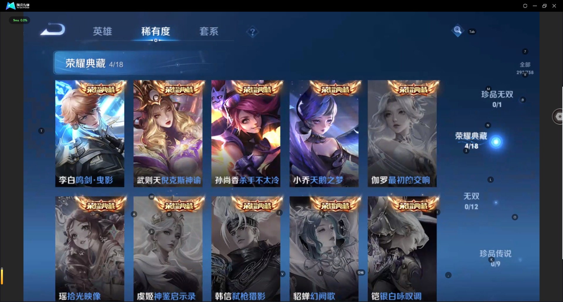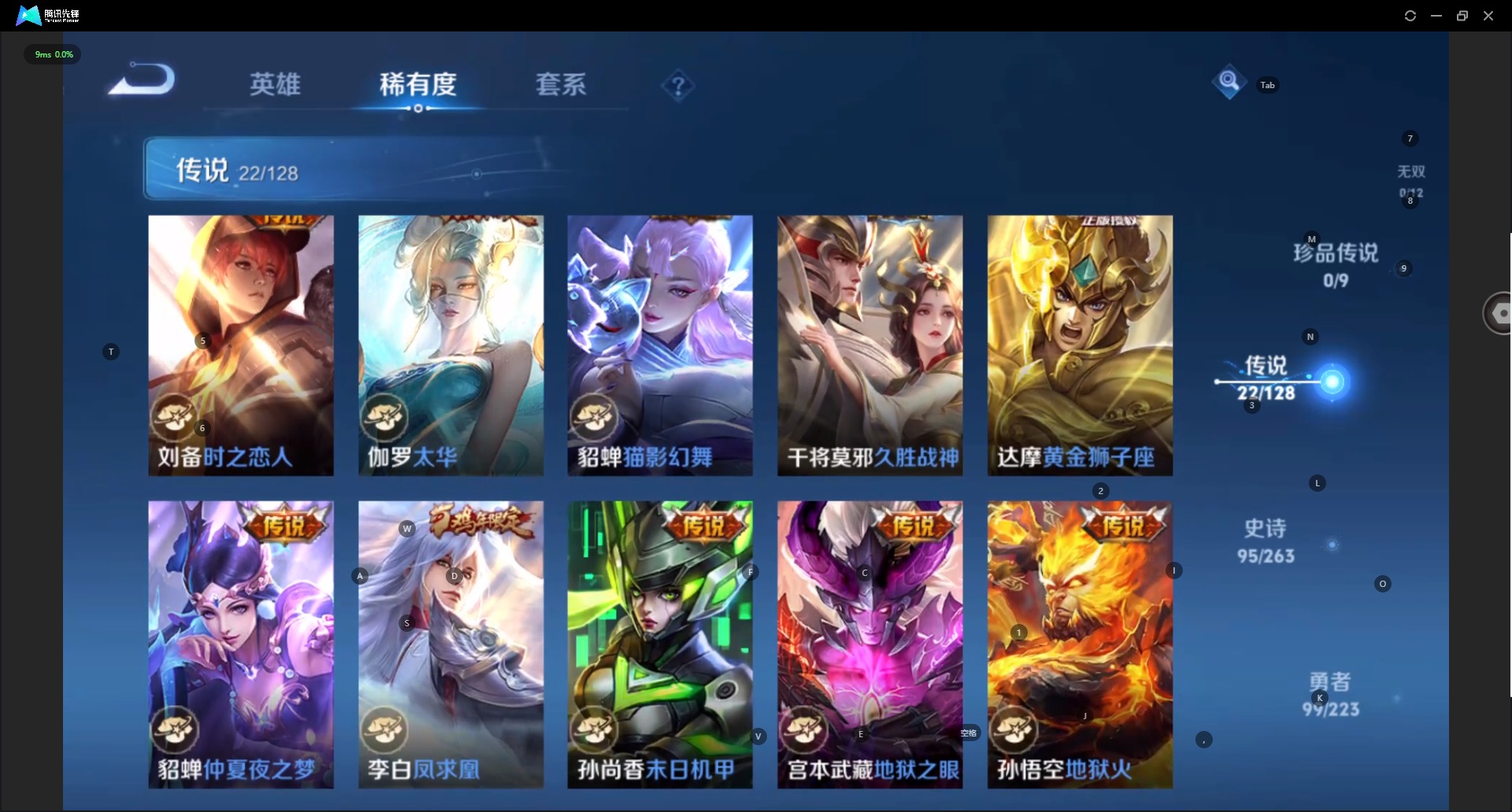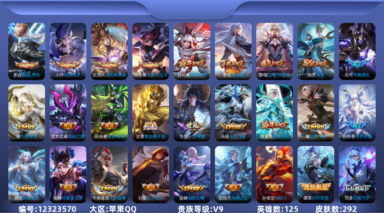 [12323570]V9 4典藏 22传说 125英雄 292皮肤 典藏英雄武则天 可修改实名 优质装备:天鹅之梦(小乔典藏),倪克斯神谕(宇宙婆娘),杀手不太冷,鸣剑·曳影,黄金狮子座,云鹰飞将(小将军),猫影幻舞,久胜战神,炽阳神光,一念神魔,末日机甲-孙尚香(绿蚂蚱),地狱火,仲夏夜之梦(大飞蛾),海洋之心,地狱之眼,时之恋人-刘备(电焊工),游龙清影(小青龙),无双飞将,山海·炽霜斩(李信年限) 珍宝阁皮:蔷薇恋人,玩趣恶龙 限定皮:至尊宝,凤求凰(白切鸡),凤凰于飞,太华(伽罗年限),异界灵契(白毛香),时之彼端,时雨天司(水龙头),神威(电光马子),飞衡(韩信年限),五谷丰年,冰锋战神,梁祝,御风骁将(吕布年限),龙胆,奔雷神使(牛魔年限),祈雪灵祝(雪兔子),天狼绘梦者,逐梦之影,朱雀志(守约年限),辉光之辰,如梦令-嫦娥,如梦令-后羿,霸王别姬-虞姬,默契交锋-花木兰,纯白花嫁,孙行者,猪悟能,天魔缭乱,青春决赛季,蜜橘之夏,山海·玄木吟(马可年限) 史诗皮:龙之律动,遇见神鹿,紫霞仙子,苍穹之光,电玩小子(小书包),白龙吟,黄金分割率,特工魅影,千年之狐,白蛇,龙骑士(小龙虾),蒙恬荣光圣徽,晚萤,魅语,冰冠公主,偶像歌手,百相守梦(刘备),末日机甲-吕布,猫狗日记-孙策,时之恋人-孙尚香,乱世虎臣,节奏热浪,修罗,女仆咖啡,摇滚巨星,水果甜心,绅士熊喵,星夜王子,心灵骇客,时之奇旅-安琪拉,功夫厨神,德古拉伯爵,暗隐猎兽者,幽灵船长,鬼剑武藏,心灵战警,舞动绿茵,地狱岩魂,繁星吟游(呼啦呼啦),缤纷独角兽,乘风破浪,逐浪之夏,水晶猎龙者,曙光守护者,金属风暴,原初追逐者,圣诞狂欢,圣诞恋歌,鹰眼统帅,暗夜贵公子,魅力维加斯,赏金猎手,无心,未来纪元-赵云