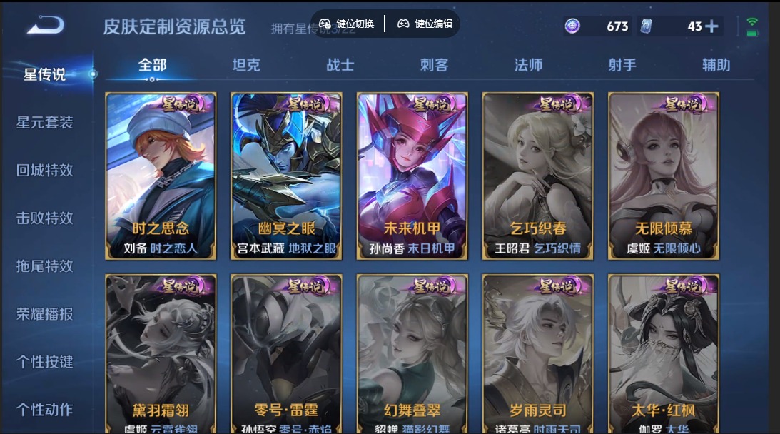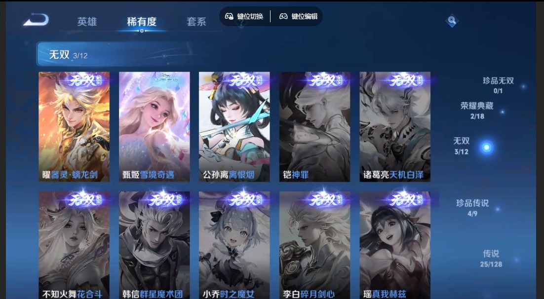 曹操天狼征服者,镜匿光追影者,诸葛亮时雨天司,公孙离祈雪灵祝,公孙离玉兔公主,司空震愿照·山河定,裴擒虎李小龙,上官婉儿梁祝,花木兰瑞麟志,桑启鸣野蒿,猪八戒猪悟能,孙悟空大圣娶亲,孙悟空至尊宝,百里玄策白虎志,马超神威,韩信飞衡,韩信逐梦之影,澜愿照·九州拓,关羽冰锋战神