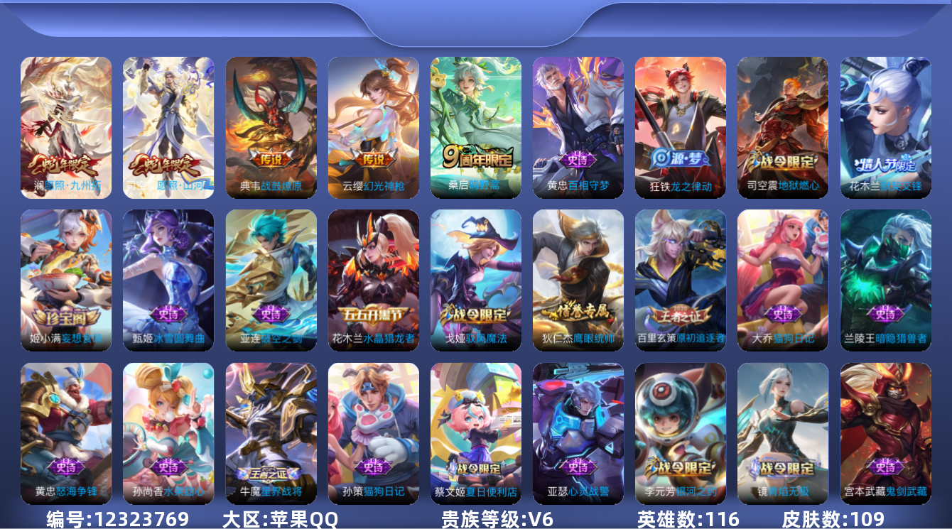 [12323769]V6 5传说 116英雄 109皮肤 可修改实名 传说皮:典韦战鼓燎原,幻光神枪 珍宝阁皮:妄想食味 限定皮:愿照·九州拓(澜年限),愿照·山河定(司空震年限),逐霄战戟,鸣野蒿,默契交锋-花木兰 史诗皮:龙之律动,蒙犽顽岩魄,破空之剑,怒海争锋,百相守梦-黄忠,星界战将,猫狗日记-孙策,猫狗日记-大乔,水果甜心,暗隐猎兽者,鬼剑武藏,心灵战警,水晶猎龙者,原初追逐者,鹰眼统帅,魅力维加斯
