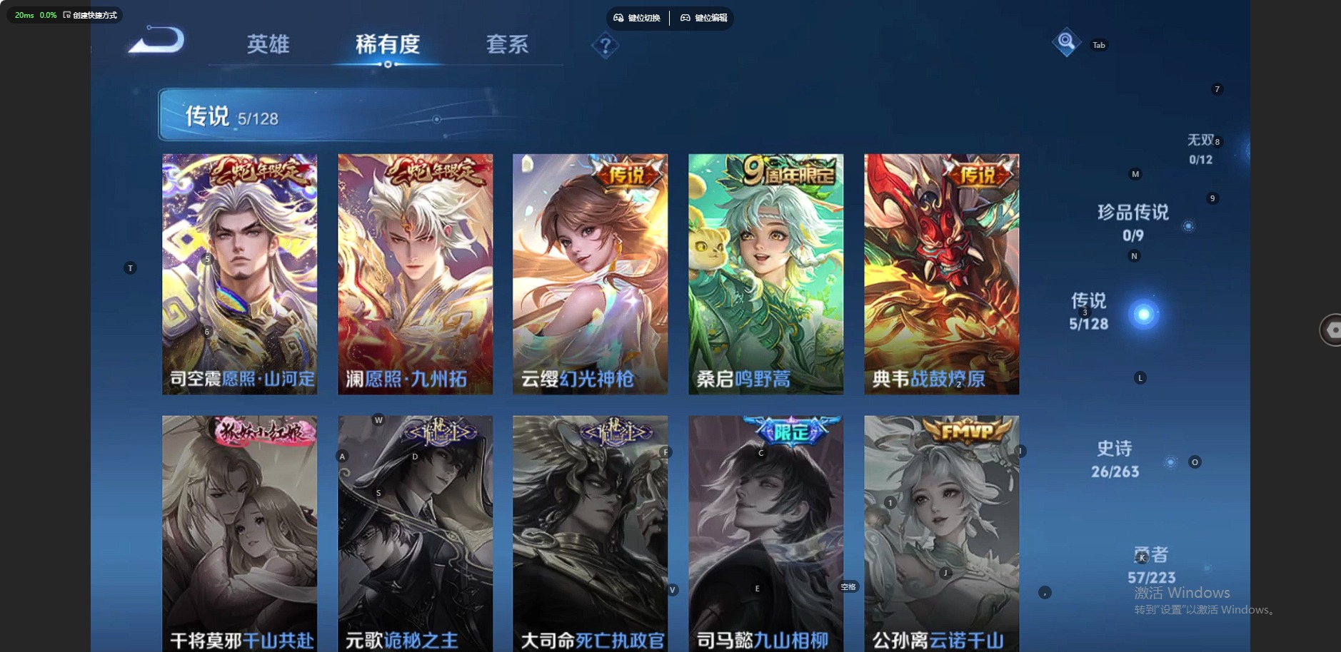 - PX_2107329-实名: 可修改 贵族等级: V7 英雄数: 123 皮肤数: 188 传说皮: 冠军飞将,炽阳神光,末日机甲-孙尚香,地狱火,地狱之眼,胖达荣荣,超时空战士-狄仁杰,山海·炽霜斩,山海·苍雷引,电玩·雷克斯 限定皮: 李小龙,引擎之心,白虎志,青龙志,瑞麟志,玄武志,朱雀志,一生所爱,大圣娶亲,五谷丰年,山海·玄木吟