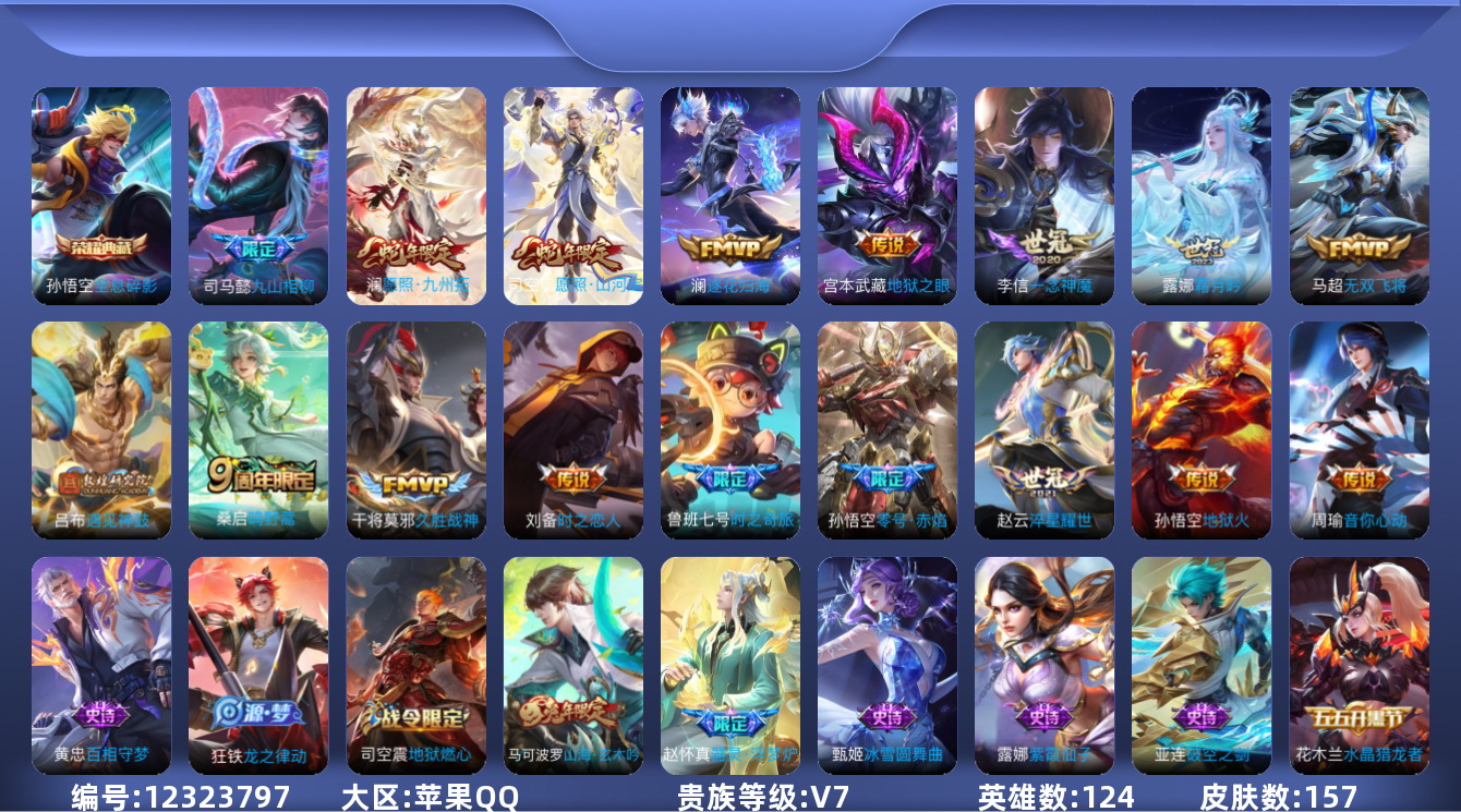 [12323797]V7 1典藏 17传说 124英雄 157皮肤 可修改实名 优质装备:全息碎影(猴子典藏),久胜战神,一念神魔,地狱火,零号·赤焰,地狱之眼,音你心动-周瑜,时之恋人-刘备(电焊工),淬星耀世,无双飞将,遇见神鼓,鲁班七号-时之奇旅,霜月吟,澜逐花归海 传说皮:九山相柳 珍宝阁皮:万物之道 限定皮:愿照·九州拓(澜年限),愿照·山河定(司空震年限),鸣野蒿,遇见飞天,逐梦之音,山海·玄木吟(马可年限) 史诗皮:器灵·浮梦炉,龙之律动,茶境仙,撼地雄心,破空之剑,百相守梦-黄忠,紫霞仙子,白龙吟,黄金分割率,特工魅影,真我赫兹(百里守约),匿光侦查者,江河有灵,闲日渔趣,百解令(蒙犽),青蛇,偶像歌手,末日机甲-吕布,节奏热浪,水果甜心,星夜王子,暗隐猎兽者,鬼剑武藏,拒霜思,乘风破浪,逐浪之夏,水晶猎龙者,箭羽风息,金属风暴,原初追逐者,鹰眼统帅,魅力维加斯