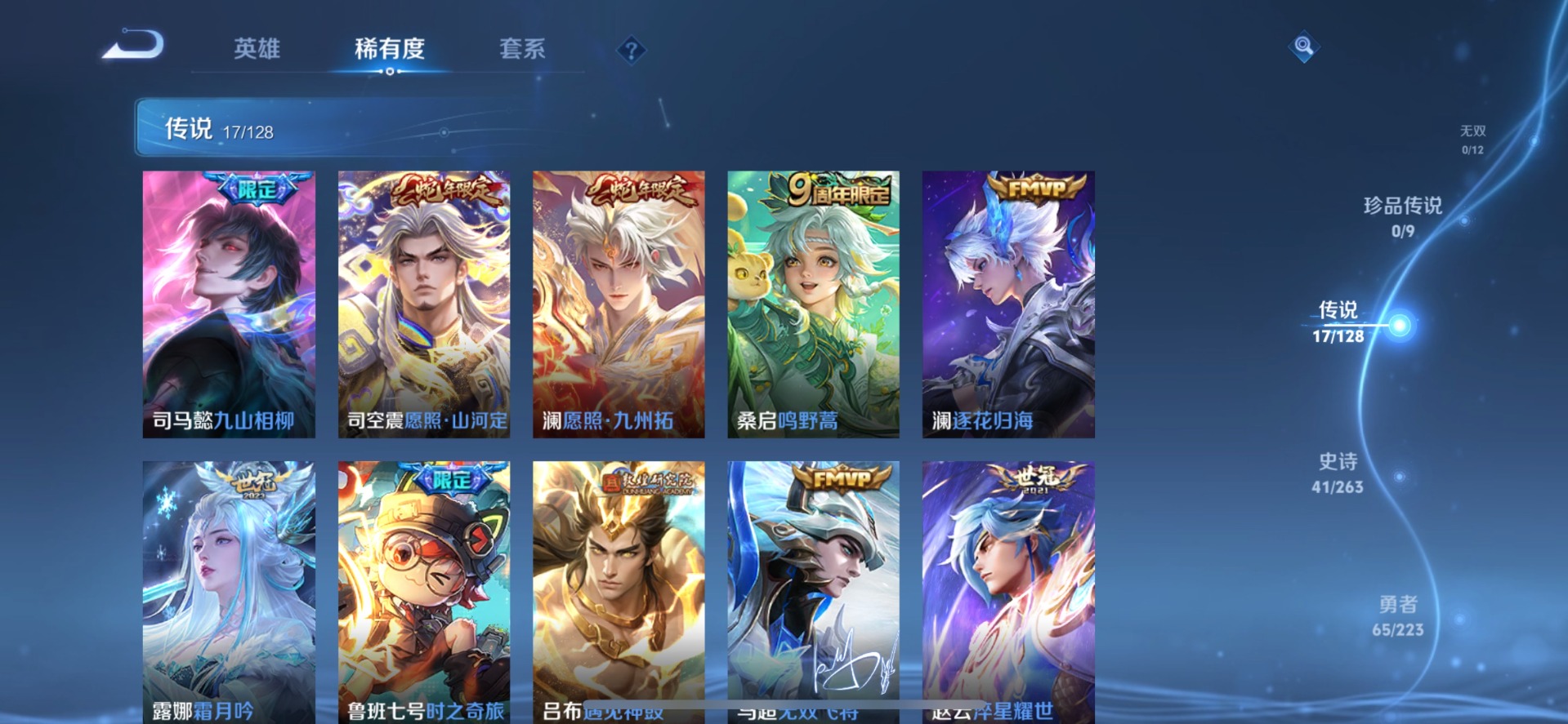 - [11991063]V8 1典藏 2无双 1珍品传说 17传说 124英雄 320皮肤 可修改实名 优质装备:鸣剑·曳影,离恨烟(公孙离无双),器灵·螭龙剑,怪盗基德,云鹰飞将(小将军),炽阳神光,李逍遥,时之恋人-刘备(电焊工),山海·炽霜斩(李信年限),山海·苍雷引(电光曜子),鹤归松栖(云缨) 传说皮:乘龙·问璇玑(孙尚香年限),乘龙·铭钟鼎(赵云年限),幻光神枪 珍宝阁皮:万物之道,蔷薇恋人,女武神 限定皮:愿照·九州拓(澜年限),鸣野蒿,白虎志(电光耗子),白晶晶,神威(电光马子),影龙天霄,遇见飞天,高山流水,五谷丰年,冰锋战神,游园惊梦,梁祝,烈魂,祈雪灵祝(雪兔子),李小龙,逐梦之影,辉光之辰,霸王别姬-虞姬,默契交锋-花木兰,引擎之心,冰霜恋舞曲,寅虎·赤拳(老虎年限),玉兔公主,山海·玄木吟(马可年限) 史诗皮:器灵·浮梦炉,星界战将,谪仙醉月,龙之律动,破空之剑,战舞者,东方月初,蒙犽顽岩魄,蔬乡物语(鲁班七号),超元猎域,百相守梦-黄忠,织梦人,紫霞仙子,电玩小子(小书包),黄金分割率,特工魅影,千年之狐,江河有灵,匿光侦查者,百解令(蒙犽),蒙恬荣光圣徽,无限星赏官,冰冠公主,偶像歌手,晚萤,电玩·爆裂旋风,银翎春语,末日机甲-吕布,猫狗日记-孙策,猫狗日记-大乔,乱世虎臣,节奏热浪,修罗,摇滚巨星,水果甜心,绅士熊喵,天才门将,星夜王子,心灵骇客,功夫厨神,德古拉伯爵,暗隐猎兽者,幽灵船长,鬼剑武藏,暗渊魔法,心灵战警,舞动绿茵,地狱岩魂,纤云弄巧,繁星吟游(呼啦呼啦),拒霜思,缤纷独角兽,乘风破浪,逐浪之夏,水晶猎龙者,曙光守护者,热力回旋,箭羽风息,金属风暴,原初追逐者,圣诞狂欢,圣诞恋歌,鹰眼统帅,暗夜贵公子,魅力维加斯,黎明之约,赏金猎手,未来纪元-赵云,玫瑰异探